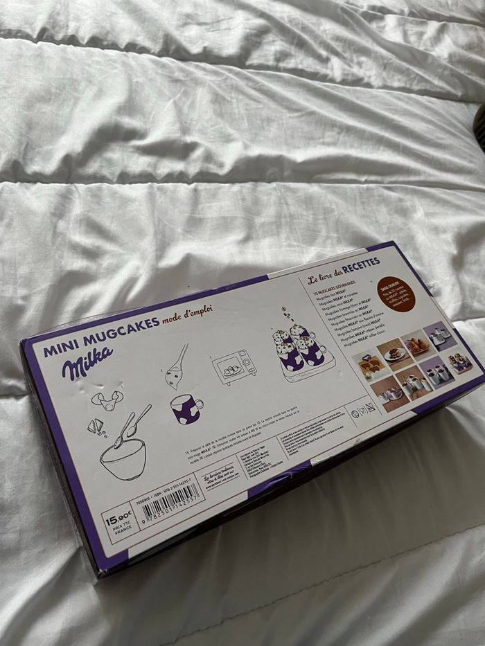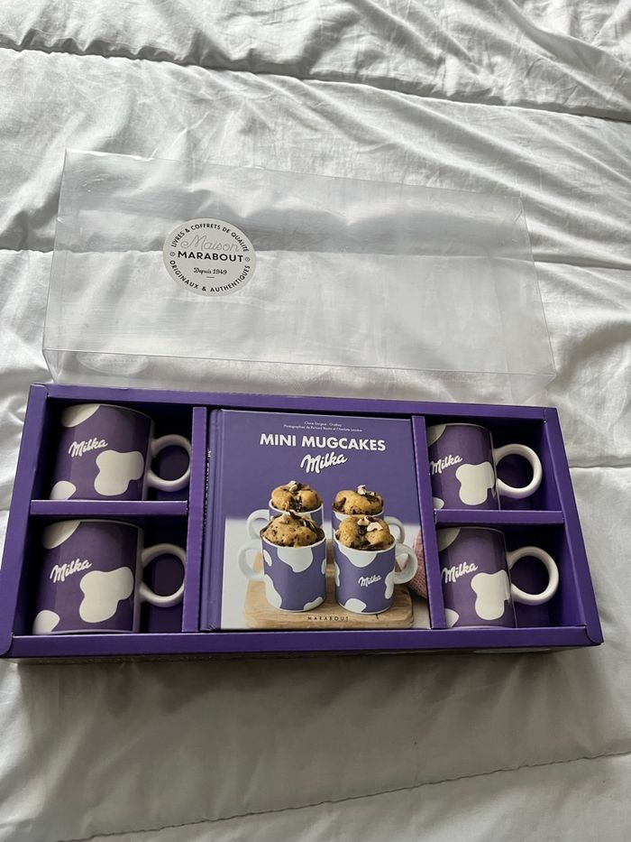 set de mug cake milka avec 4 tasses et un livre de recettes