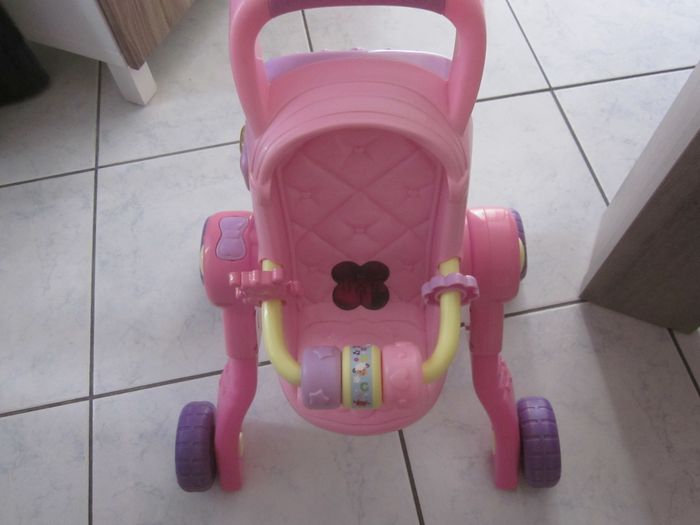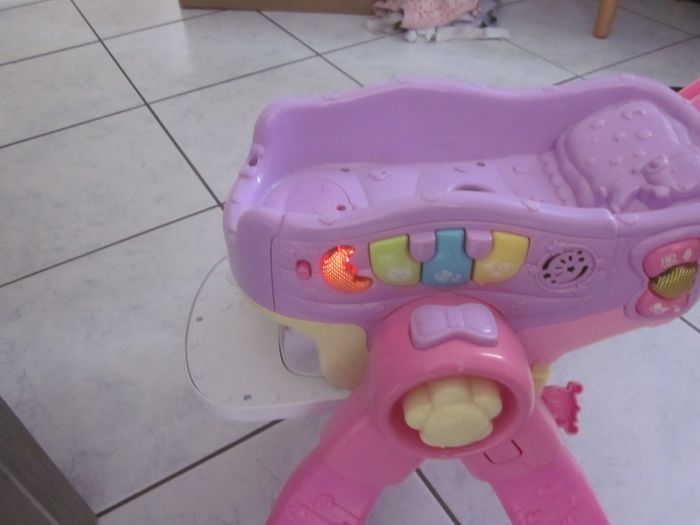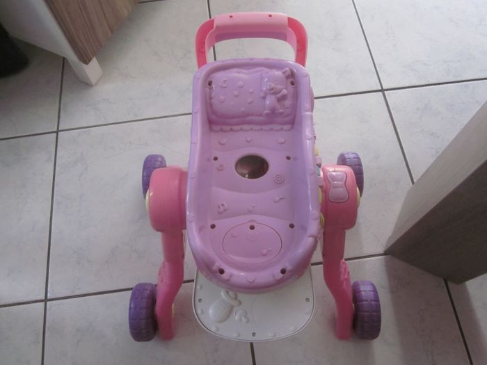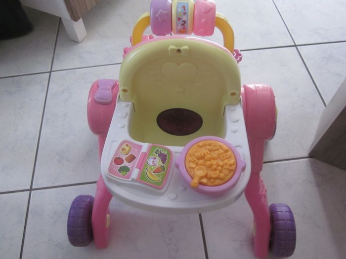 dès que la pitchoune tient sur ses jambes, trotteur d'éveil, multi positions (chaise haute, poussette, landau, le basculement se fait en appuyant sur le petit noeud violet), musical (j'ai mis des piles neuves, 2 AA)
