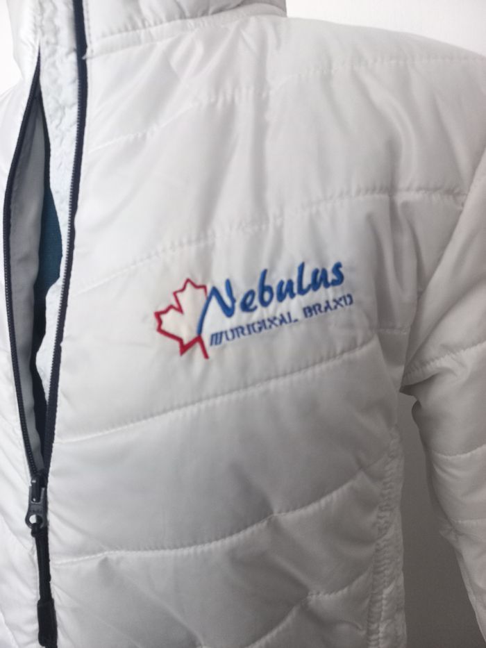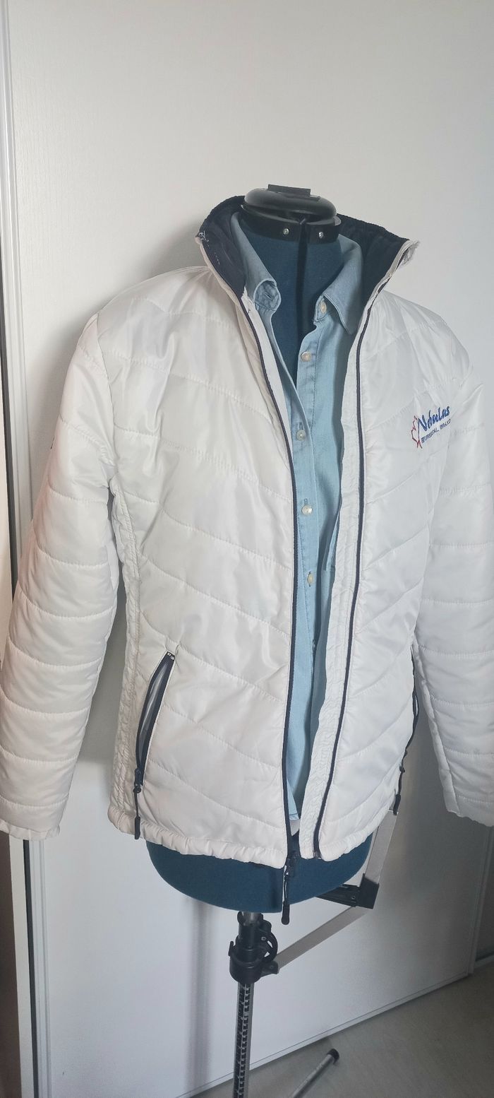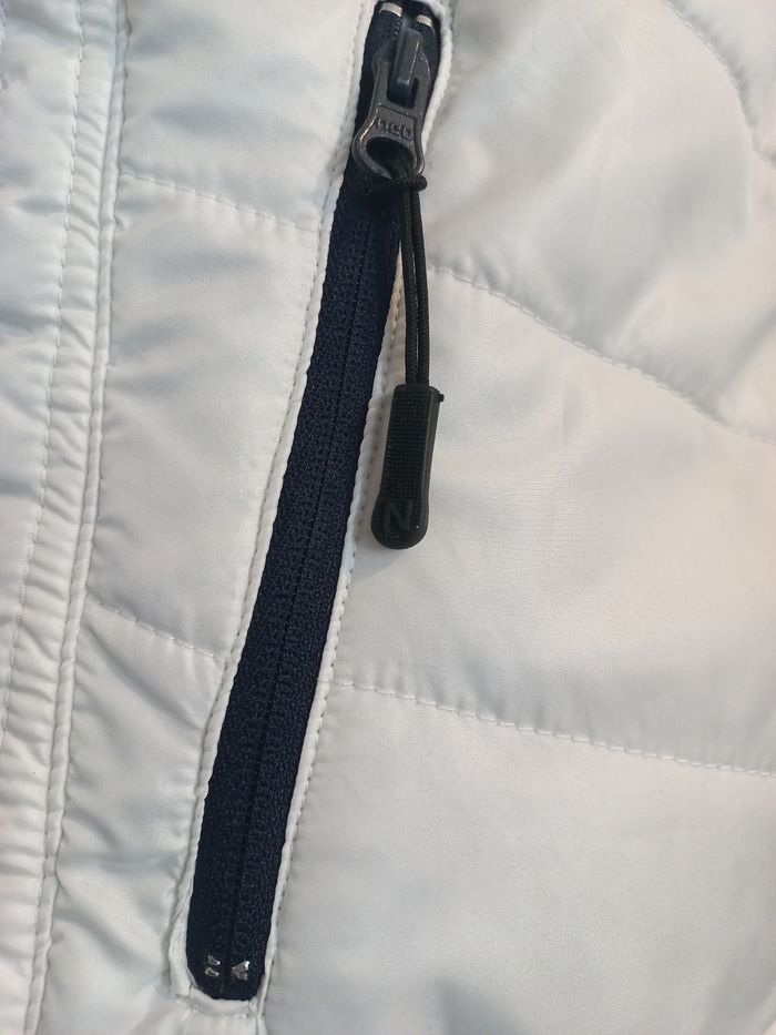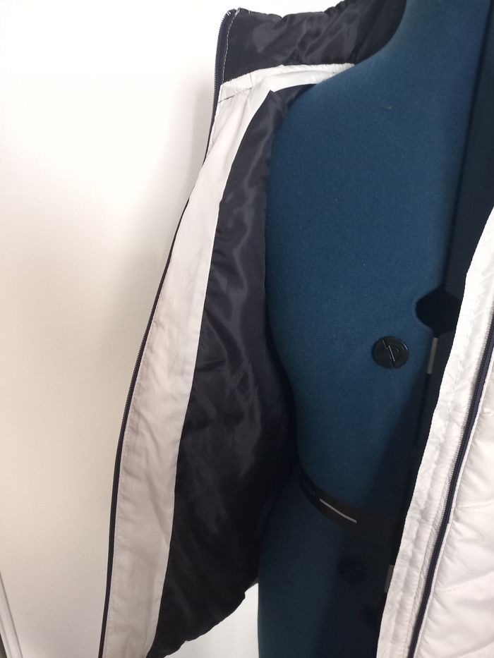 Doudoune blanche de la marque norvégienne Nebulus, en taille S, intérieur contrastant marine. Bien étudiée : * col montant rabattable, * protection haut de zip, * "Neb" sur les curseurs zip * tirettes signées du N de la marque. * Surpiqûres chevron, pour un modele tendance, * marque brodée poitrine et manche. Etat irréprochable, l'entretien est facile, elle passe en machine à 30° Mesures : Largeur sous bras 45 cm Hauteur de épaule a base 65 cm Envoi rapide et soigné. Si question, prendre contact