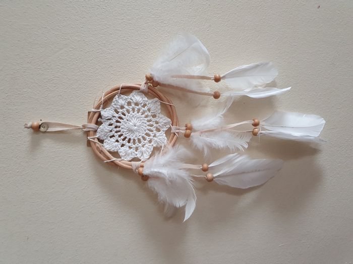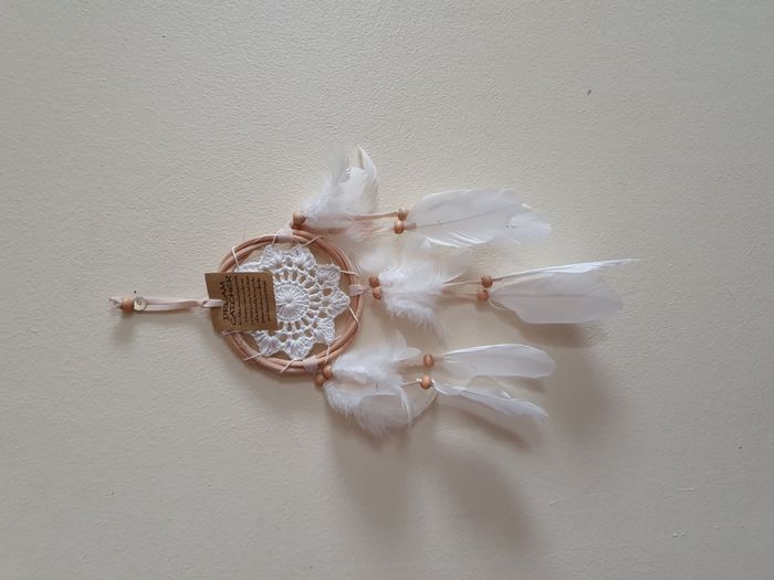 Attrape rêves blanc et bois Longueur : 34 cm Largeur : 12 cm Diamètre : 10 cm Poids : 15 grammes Fabrication artisanale Neuf avec étiquette