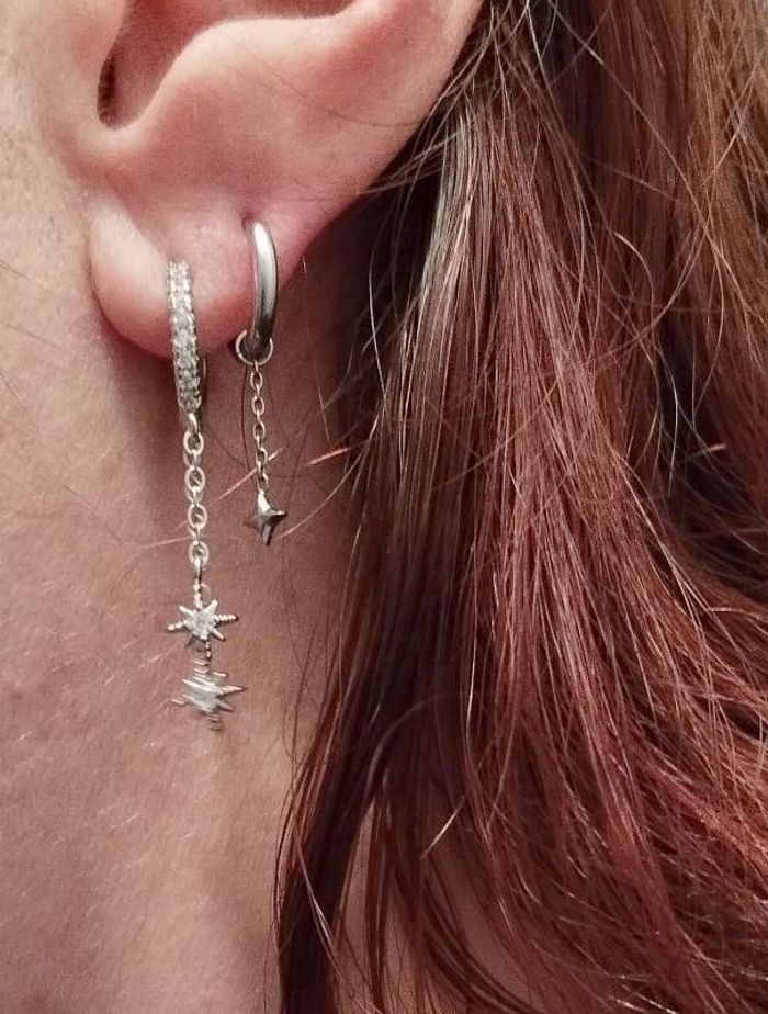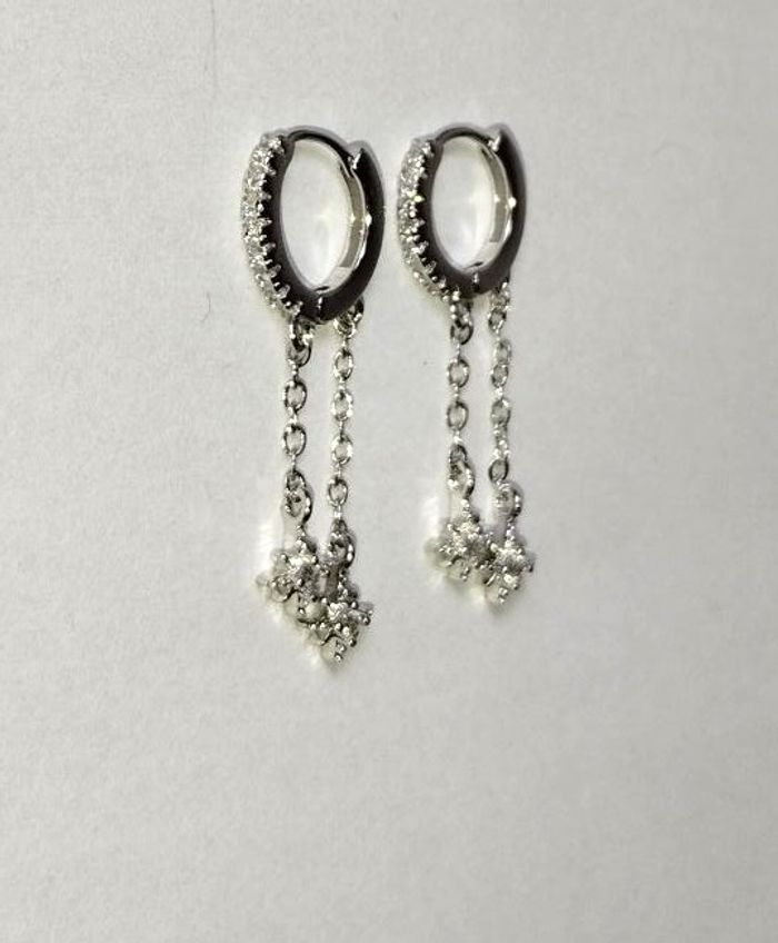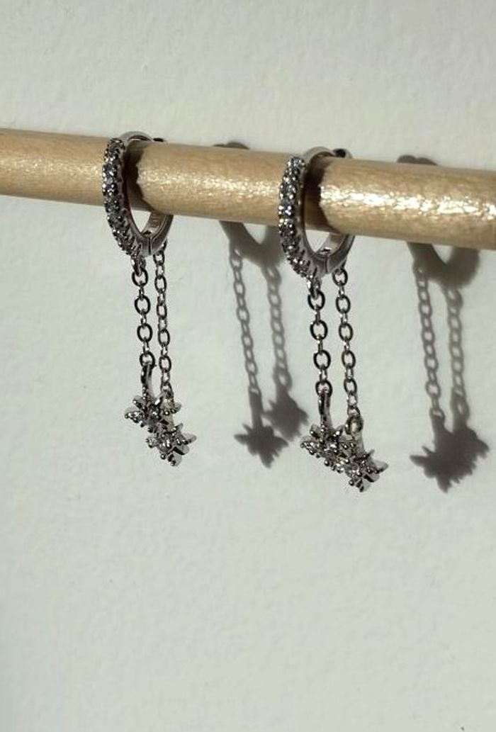 Paire de boucles d'oreilles créoles en argent 925 pavées de zircons scintillants avec 2 chaines fines et charms petites étoiles brillantes