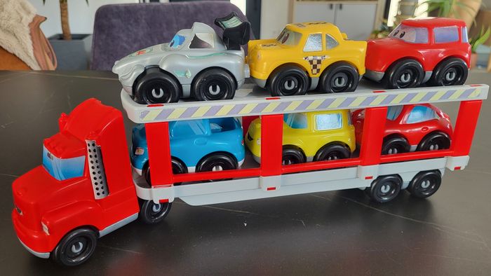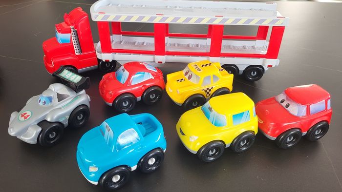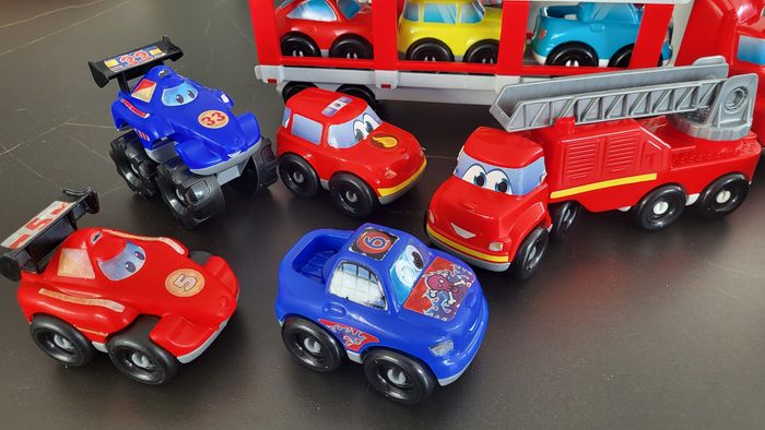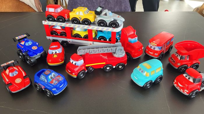 15 voitures, un camion de pompier et très bon etat et un camion transporteur. Bon etat général, les autocollants sont abîmés sur certains véhicules a force de lavage mais les voitures sont en tres bon état.