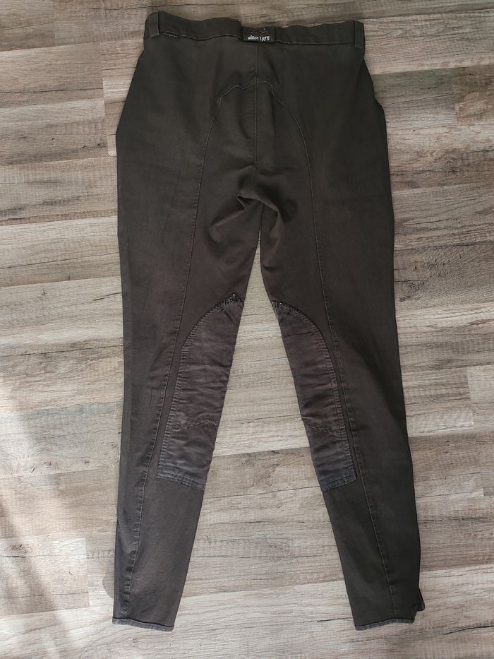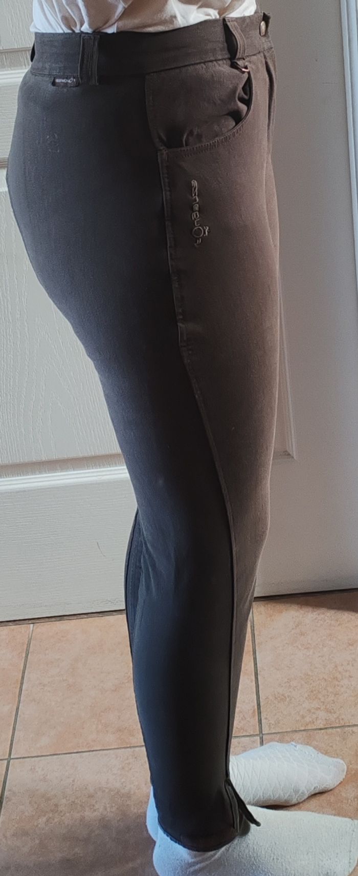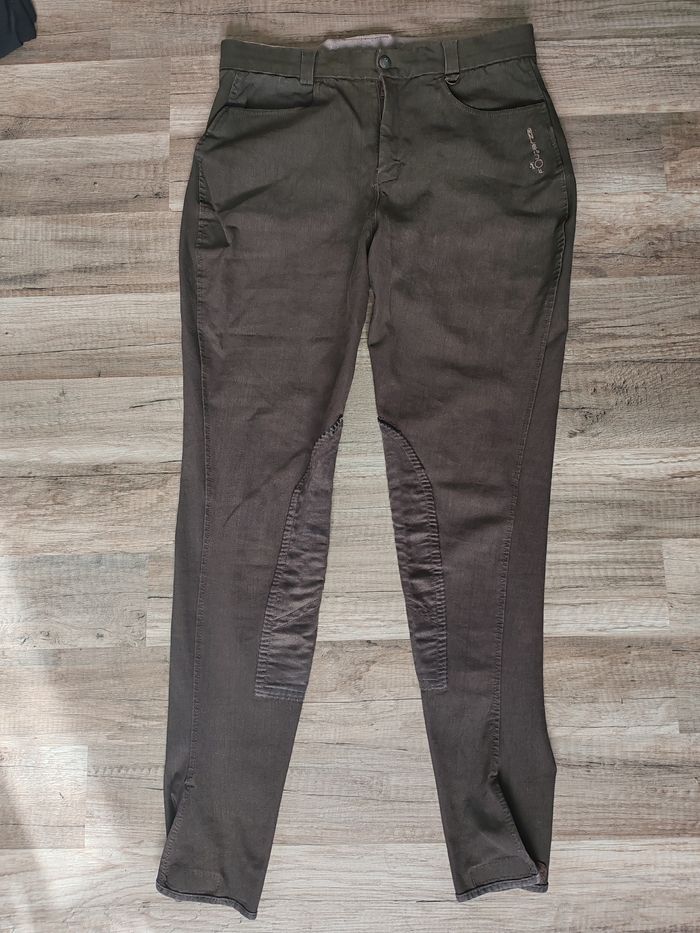 Pantalon d'équitation de la marque fouganza, taille 16 ans (36-38), couleur marron avec tissu supplémentaire au niveau des cuisse (très légère marque d'usure dessus). 66 % de coton