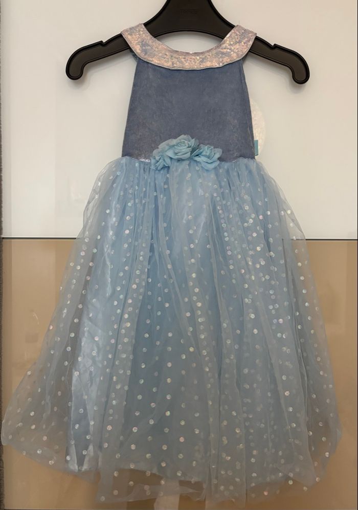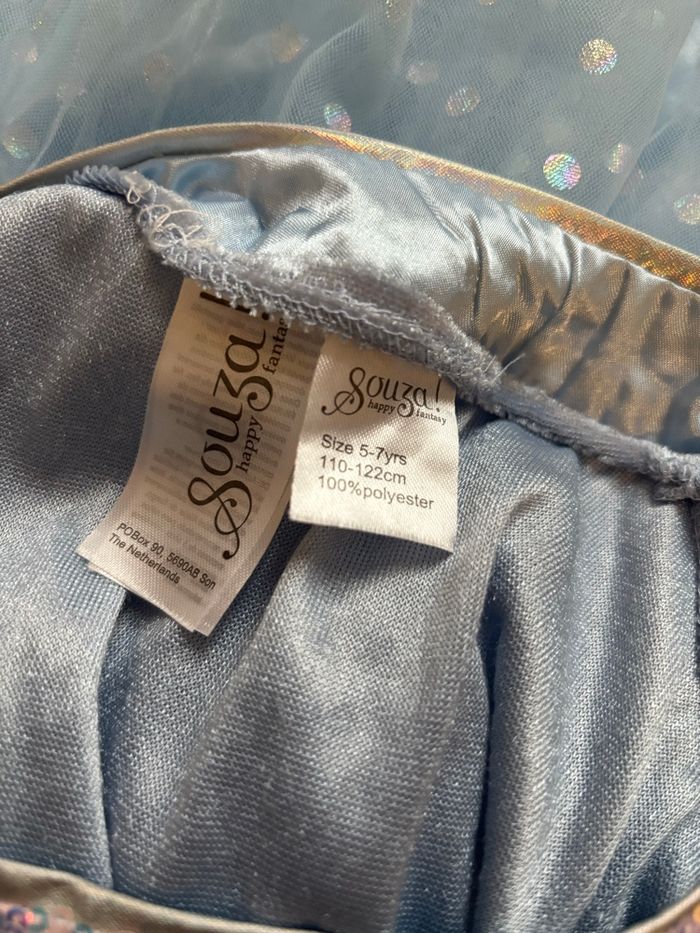 Voici la magnifique robe bleue Emily. Avec un corsage en velours stretch, une jupe gracieuse en tulle avec de beaux points et des fleurs bleues sur la taille. Taille 5-7 ans 110/122 cm Les déguisements et accessoires Souza sont faits avec des tissus et matériaux de haute qualité. État neuf