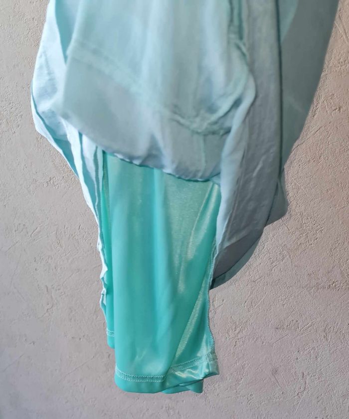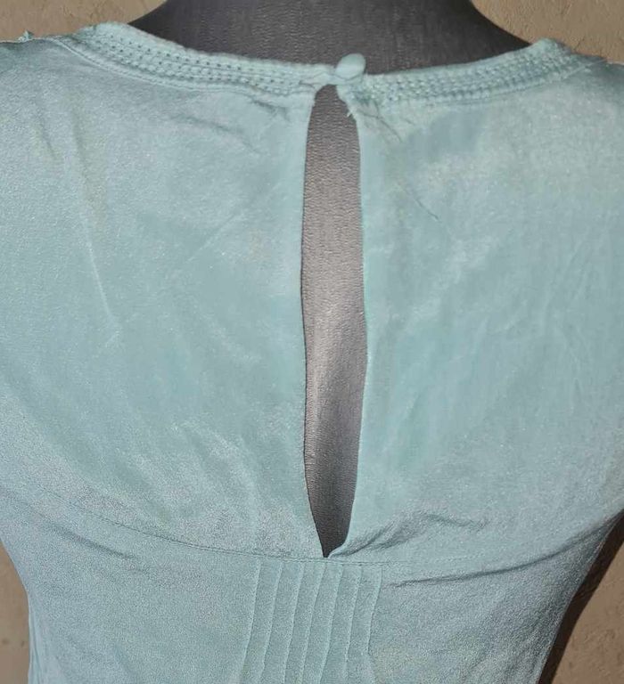 CAMAÏEU robe en soie satinée / brillante doublure polyester vert d'eau / turquoise volants manches fermeture goutte d'eau longueur 88cm aisselles 44cm #lesplacardsenfolietaille36 ref5