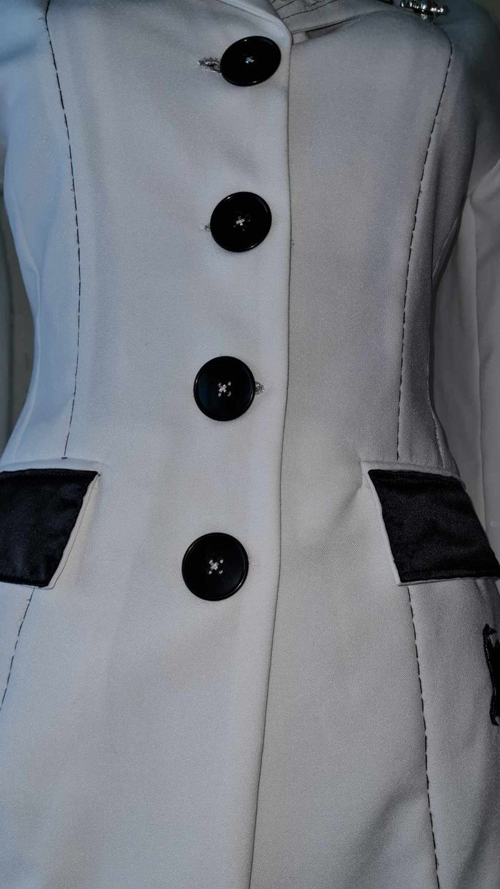 ancienne veste Jennyfer customisée modèle unique blanche cintrée tissu simili cuir noir et satiné poches / col tissu noir satiné broche tête de mort argentée sur le col fil noir / argenté épaulettes longueur 60cm aisselles 49cm épaules 38cm taille 78cm manches 61cm #lesplacardsenfolietaille36 #lesplacardsenfolietaille38