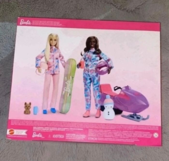 coffret de deux barbie avec un chien, un bonhomme de neige, une moto neige et un snowboard ainsi que d'autres accessoires - neuf sous emballage jamais ouvert en parfait état - neuf parfait pour offrir - envoyé en carton et bien protégé avec du papier bulle