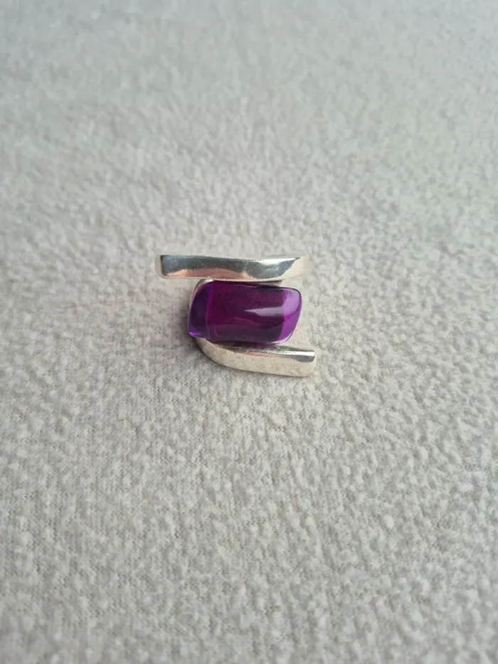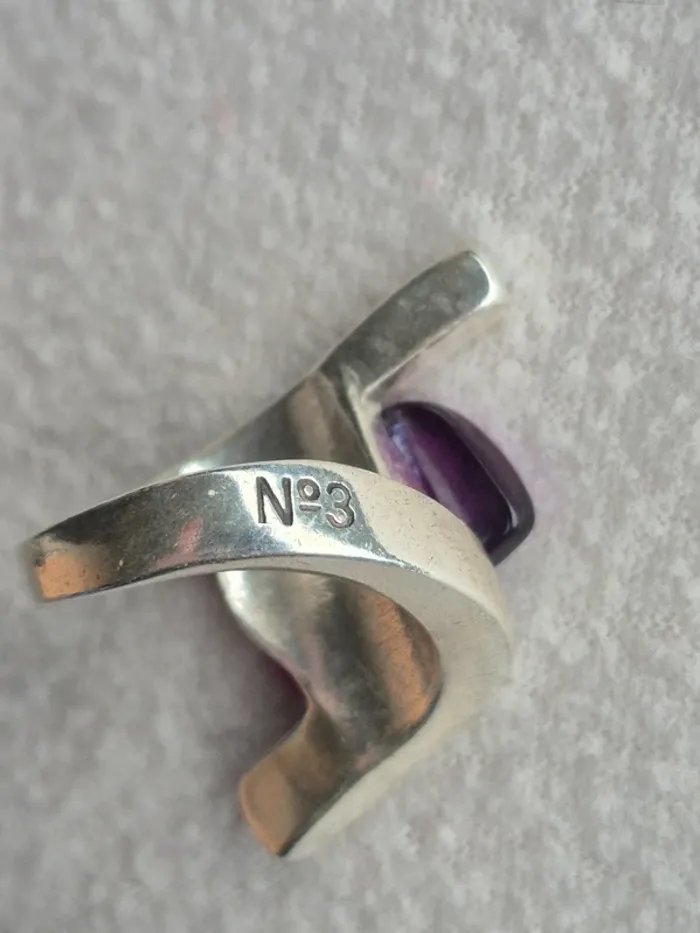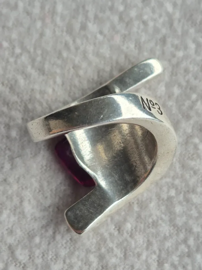 💍 Bague Sculpturale N°3 - Neuve & Rare 💜 Affirmez votre style avec cette magnifique bague de la marque N°3, une pièce créateur au design audacieux et architectural. Un véritable bijou de caractère ! 💎 Pourquoi on l'adore : Design : Une forme "bypass" ultra moderne en métal argenté qui vient enlacer le doigt avec élégance. Détail central : Ornée d'une superbe pierre (ou résine haute qualité) rectangulaire d'un violet améthyste profond et lumineux 🍇. Taille : 54. État : Neuve, jamais portée ! Elle est impeccable, comme en témoignent les photos. Signature : Marquée "N°3" à l'intérieur de l'anneau, gage d'authenticité et de qualité.