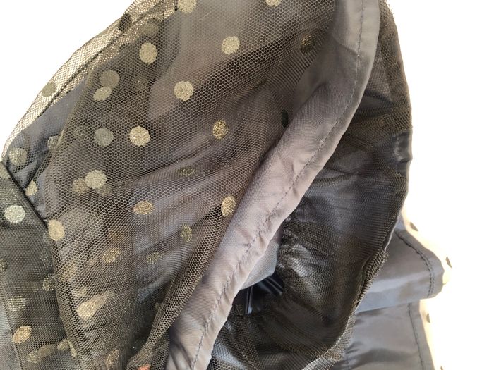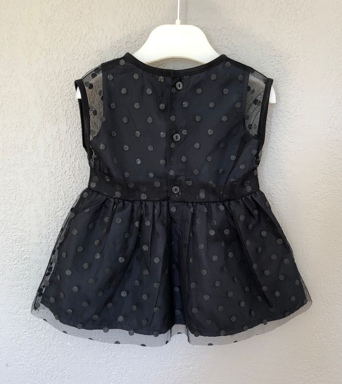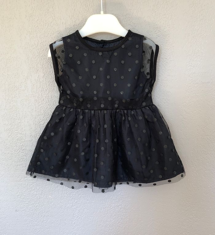 Robe Kiabi, Taille 6 mois/ 63-69 cm, Sans manches, Doublée. Superbe robe habillée, de soirée, cérémonie, Noël, fêtes de fin d'année…ou originale pour la vie de tous les jours. Doublure bleu marine très foncé recouverte de tulle à pois noirs discrètement pailletés. Le jupon est composé de trois couches : 1 doublure bordée d’une bande de tulle, 1 autre doublure, 1 couche de tulle. Pour marquer la taille il y a deux épaisseurs de tulle, pour un effet ruban/ceinture. Ouverture par boutons en haut du dos. Neuve, lavée mais jamais portée. 🌸 Vous aimez cet article ? N’oubliez pas de visiter le reste de mon dressing en filtrant les tailles.