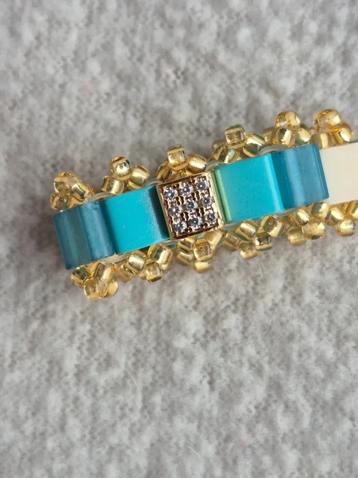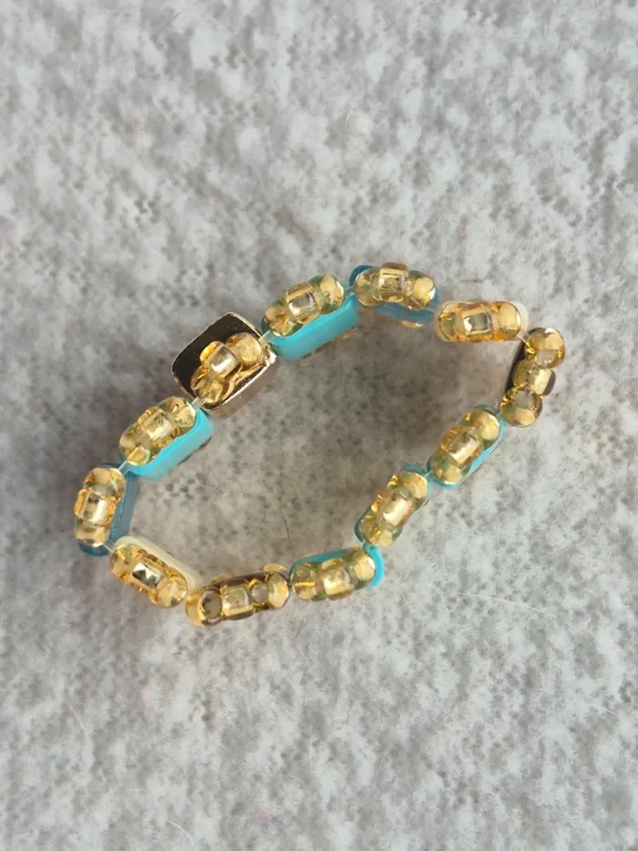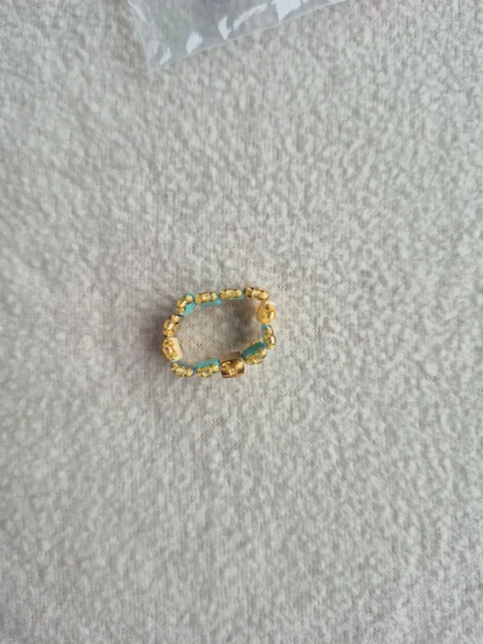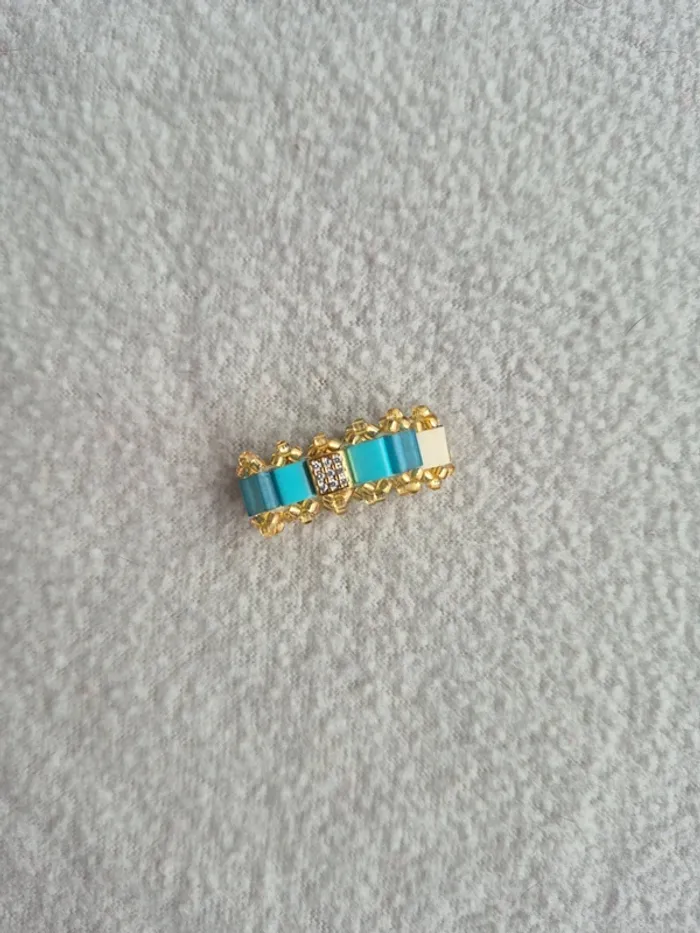 ✨ Magnifique Bague Ajustable Hypnochic - Neuve ✨ Ajoutez une touche de soleil et de bohème chic à vos mains avec cette superbe bague de la marque Hypnochic ! ☀️💍 💎 Les détails qui font craquer : Style : Un design artisanal unique composé de perles de rocailles dorées et de perles plates aux nuances turquoise et crème 🌊. Éclat : Ornée d'un élégant petit carré central serti de cristaux brillants pour une touche de lumière irrésistible ✨. Confort : Modèle ajustable grâce à son montage sur fil élastique de haute qualité, elle s'adapte parfaitement à toutes les morphologies de doigts ! État : Neuve, jamais portée (encore dans son petit sachet d'origine avec l'étiquette de prix) 🏷️.