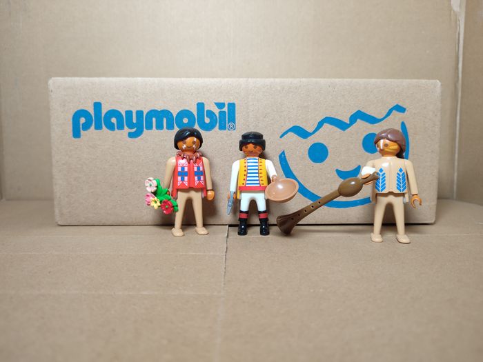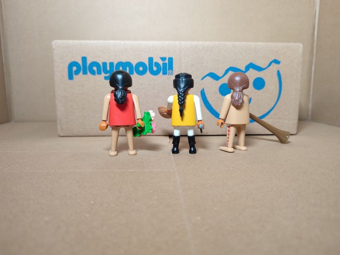Produit d'occasion playmobil Ce set comprenant 3 personnages Amérindiens, 1 instrument de musique, 1 hache, 1 bol, 1 bouquet de fleurs et 1 collier