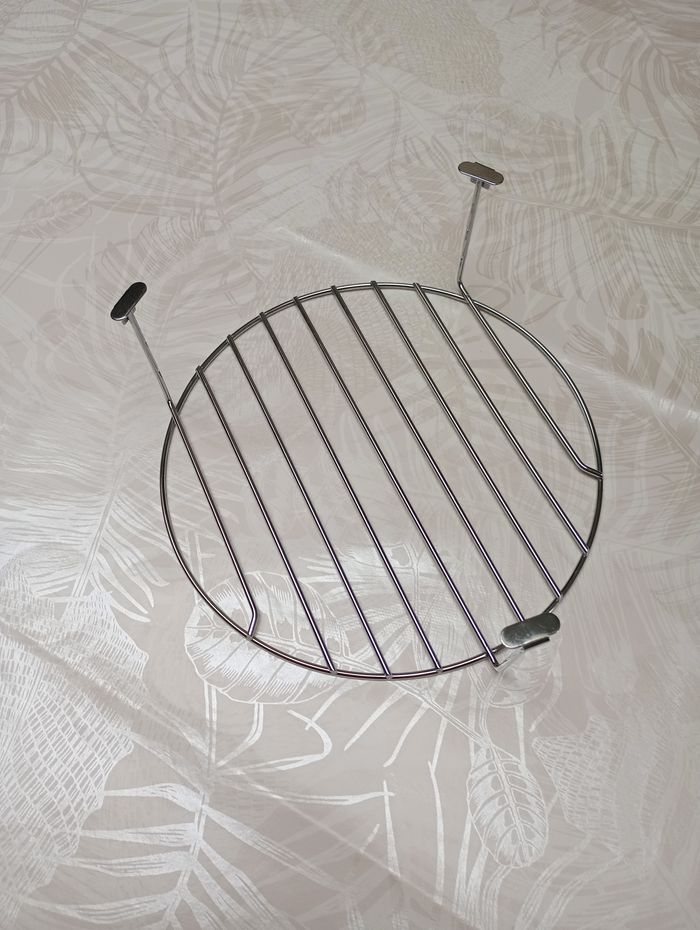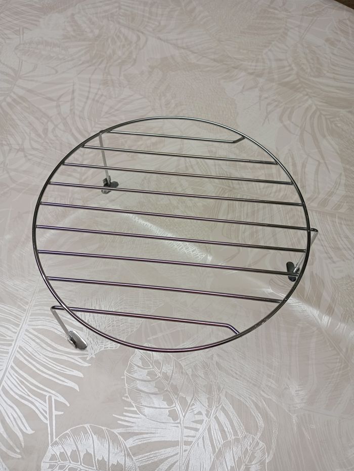 Support grille pour micro-ondes. Hauteur : 8,5 cm. Diamètre grille : 22 cm. Diamètre pied : 23 cm. Neuve.