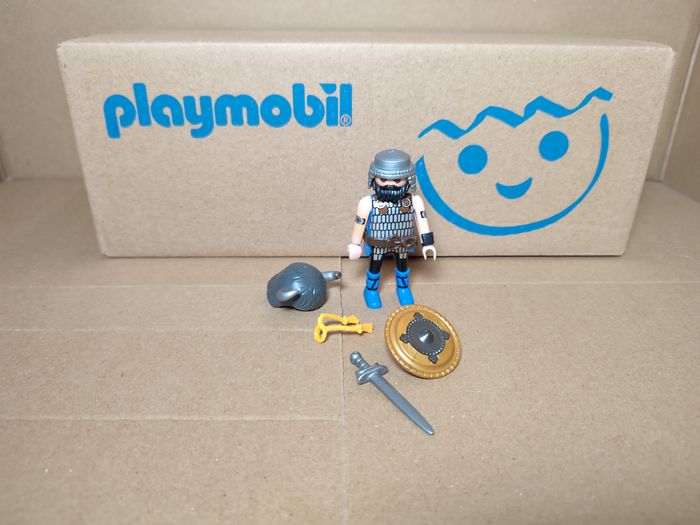Produit d'occasion 4677 playmobil Ce set contient : 1 personnage, Son casque, Épée, Bouclier (La lance du set d'origine est absente)