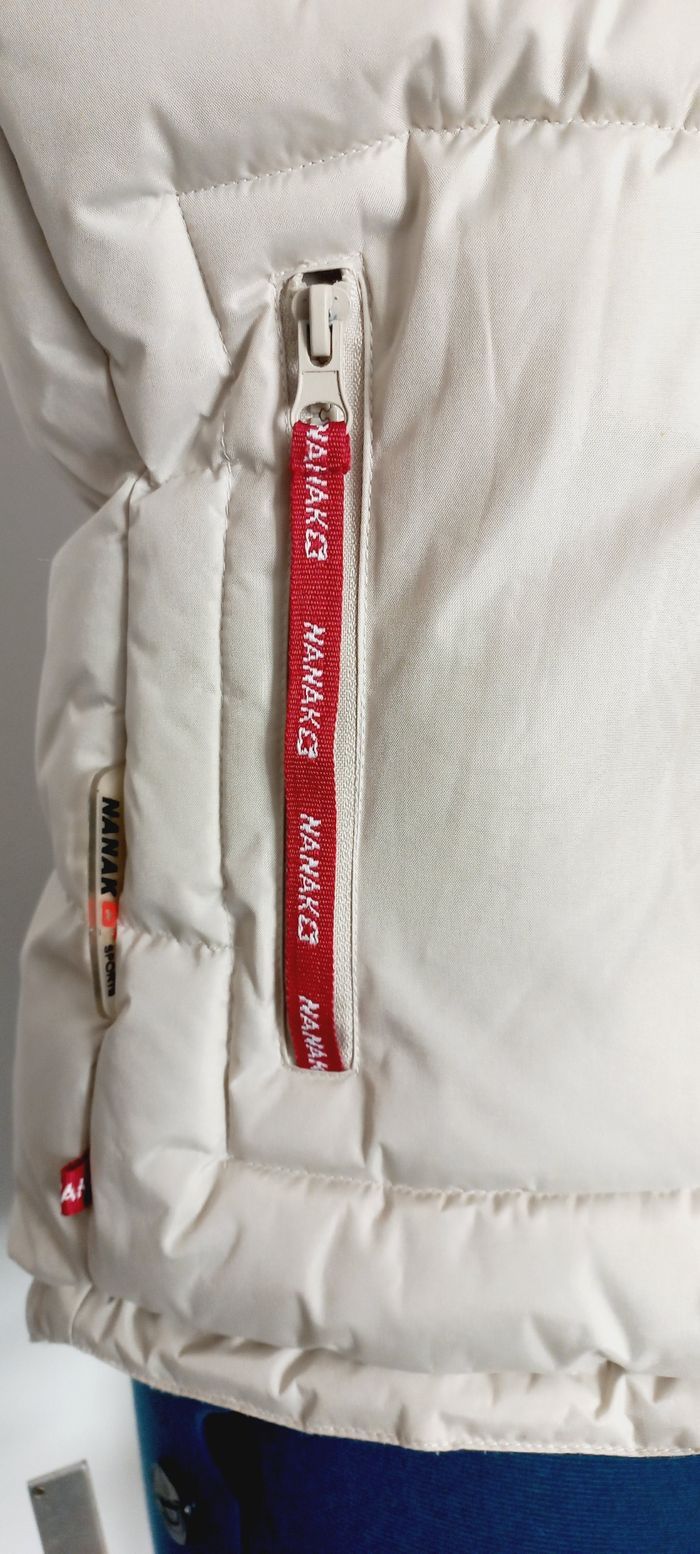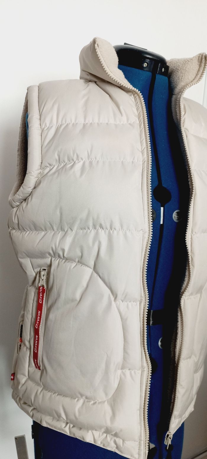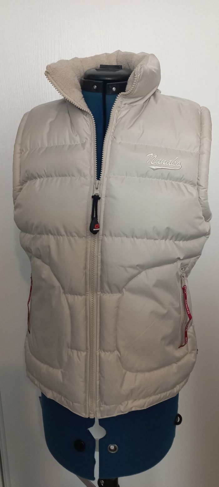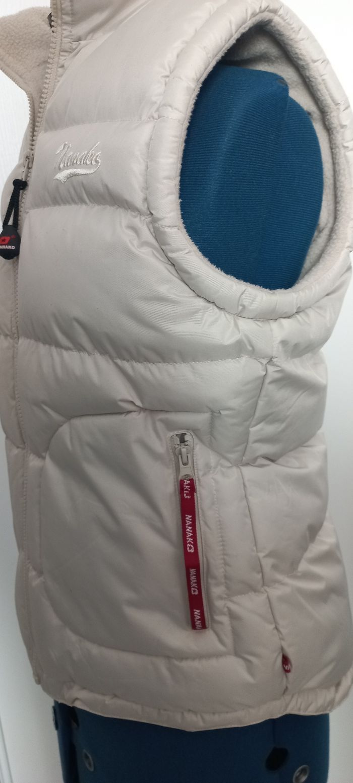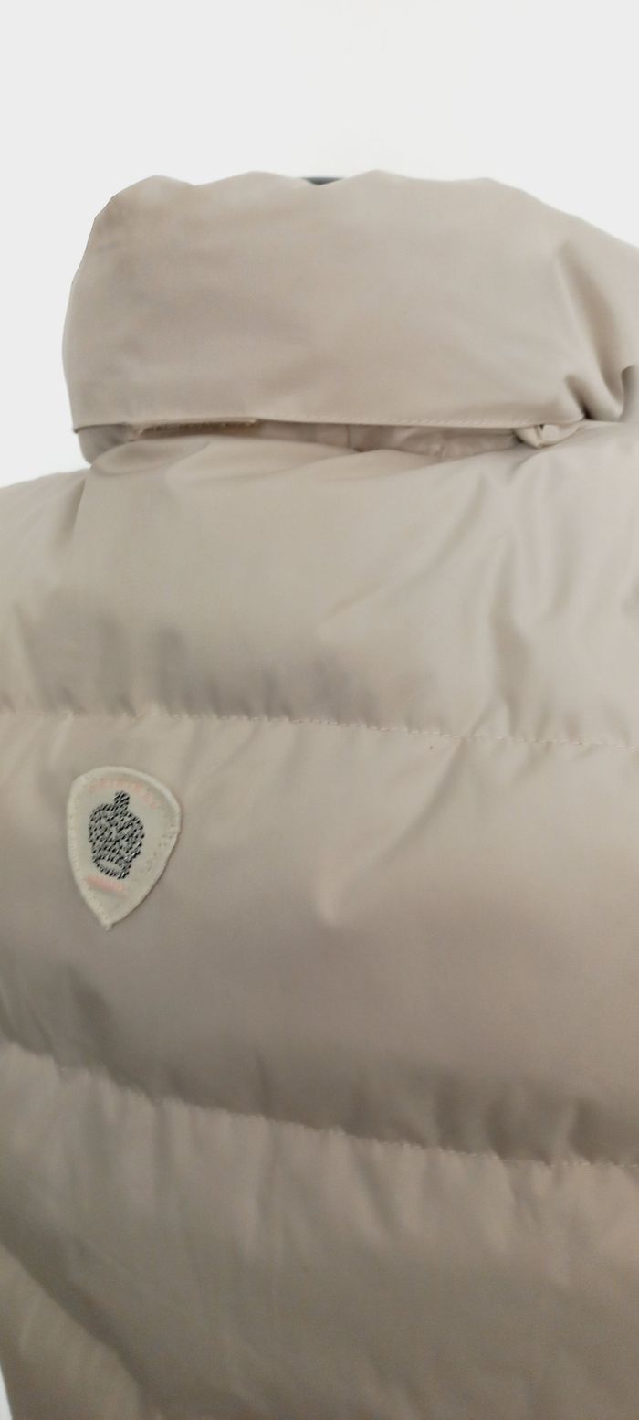 Doudoune sans manches, beige -- Imperméable, -- doublée polaire, -- capuche dans le col, -- broderie poitrine et patch au dos. * Sans défaut pas de tache, ni accroc. * Entretien facile : passe en machine a 30° Taille 36 / S, notée M qui taille petit, voir dimensions : Largeur sous bras : 45 cm Hauteur 60 cm Envoi rapide et toujours soigneusement emballé