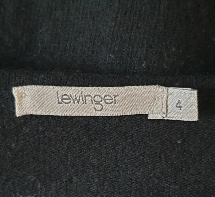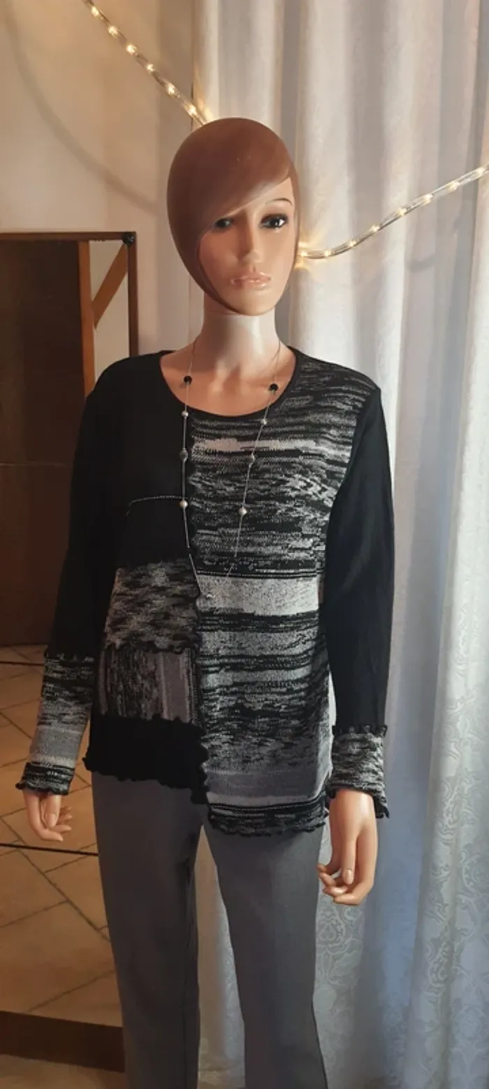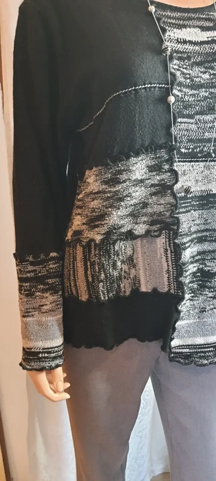 Pull femme #Lewinger, noir et blanc Fin, taille L, manche longue Destructuré, col rond 30% polyamide, 29% viscose, 24% laine 12% acrylique, 4% cachemire, 1% nylon Dimensions à pat: épaule 40 cm., sous aisselle 52 cm., Hauteur 62 cm.