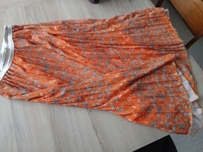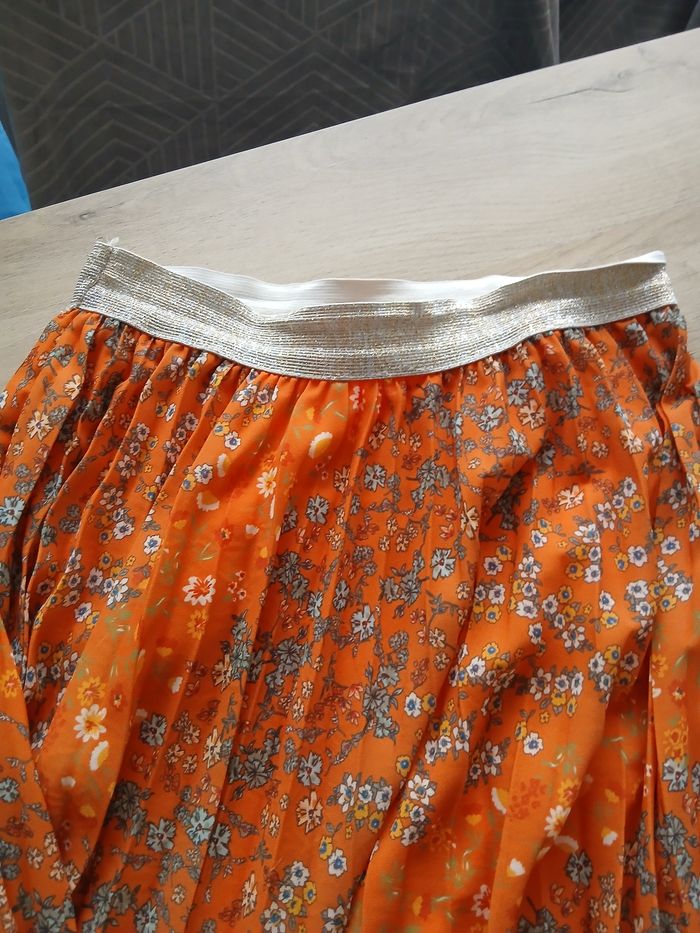 Jupe longue voile froncée orange à fleurs longueur 75cm,taille élastique doré.
