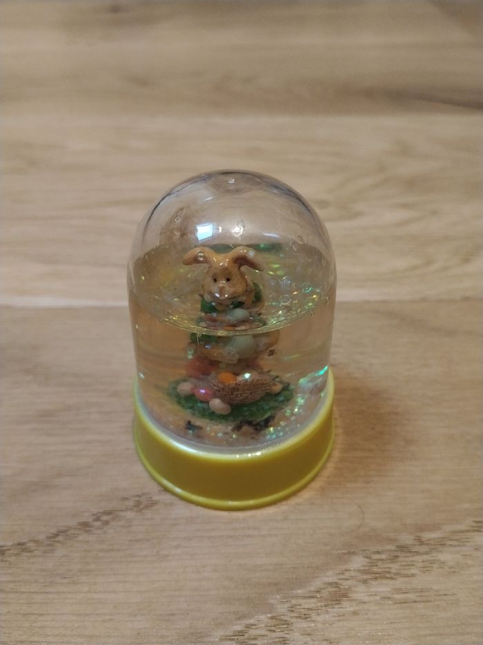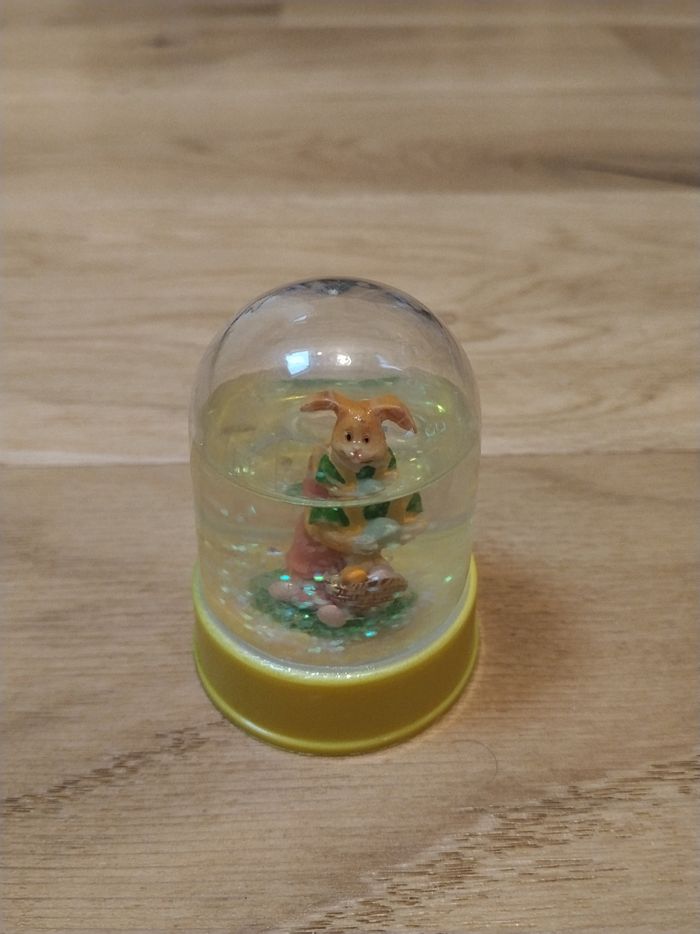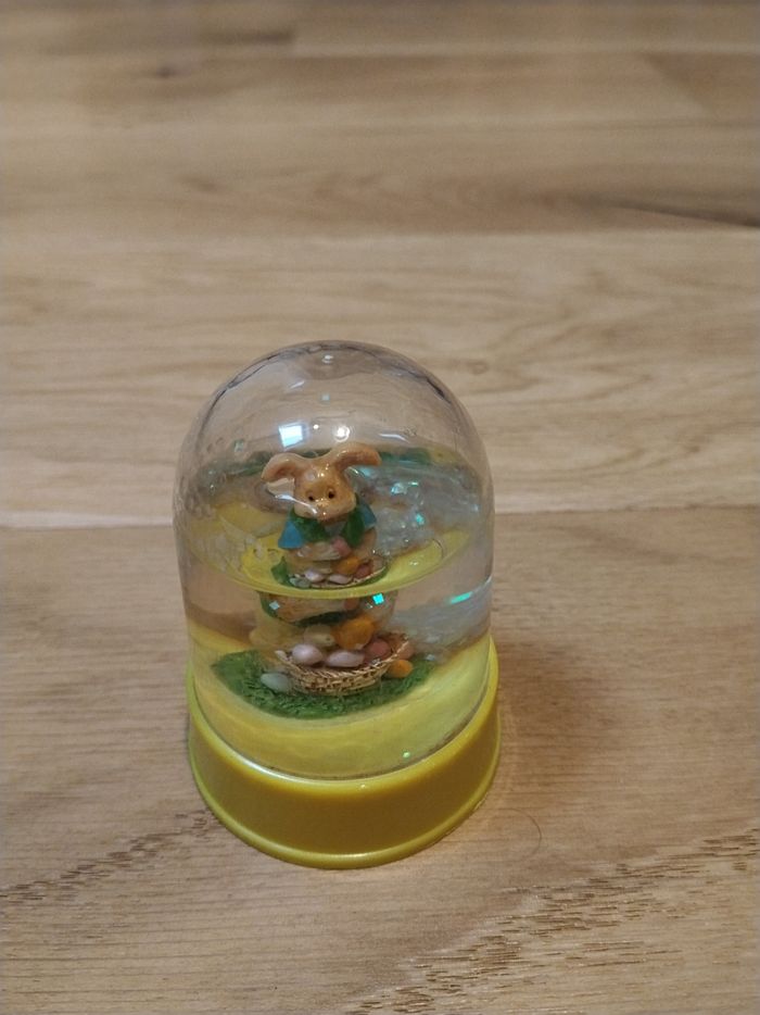 Boules avec le socle jaune représentant un lapin de Pâques avec des œufs. H 7 cm X L 5 cm. Il manque de l'eau. PVC.