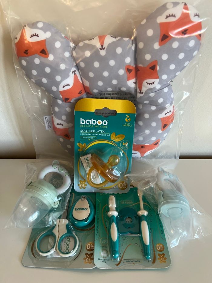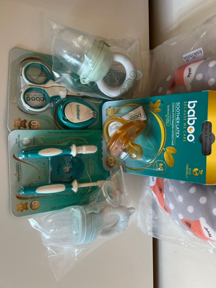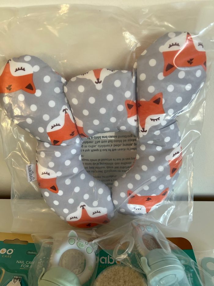 Kit naissance composé de 2 grignoteuses avec 3 tétines, 1 tétine, 1 coupe ongles et 1 paire de ciseaux, 1 brosse à dent et 1 pour masser les gencives ainsi qu’un petit cale tête renard pour dans la siège auto. Tout est neuf sous emballage scellé.