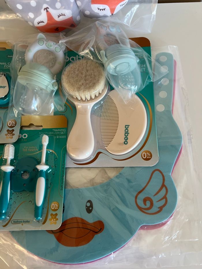 Lot naissance composé de 2 grignoteuses avec 3 tétines, 1 tétine, 1 coupe ongle, 1 paire de ciseau, 1 brosse pour la tête, 1 brosse pour les dents et les gencives, 1 cale tête renard tout doux pour dans le siège auto et 2 petits bonnets tour de tête pour protéger leur yeux lors du bain. Tout est neuf sous emballage scellé 0% BPA