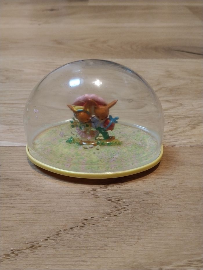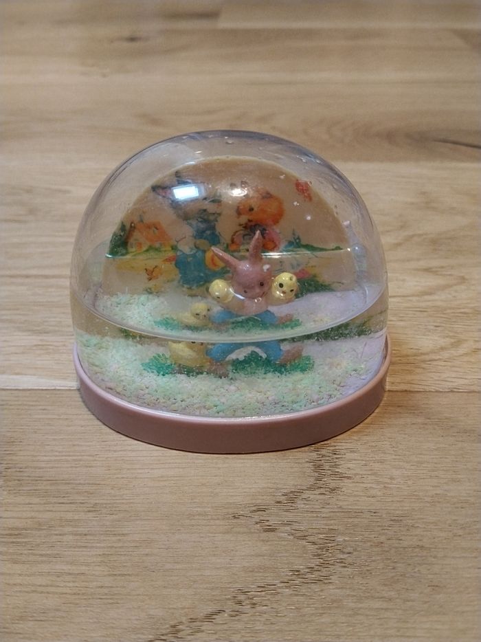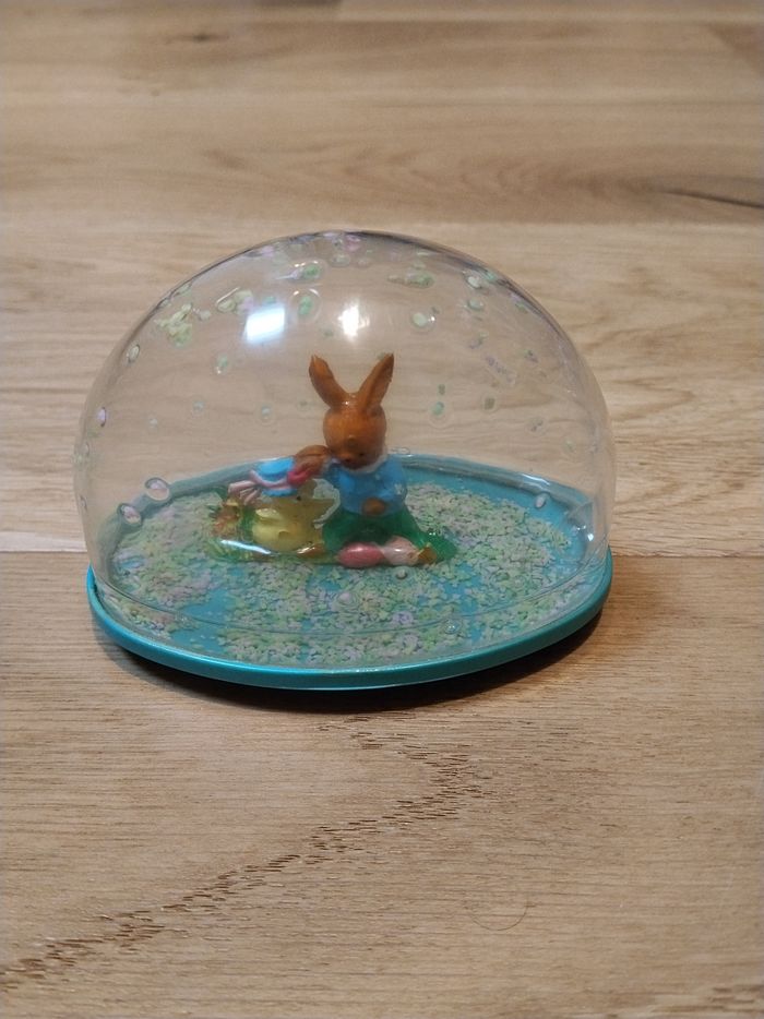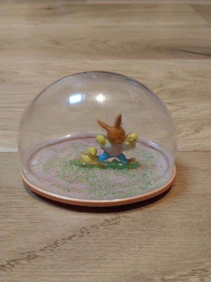 -1 boule socle rose avec un lapin et un poussin H 7 cm X L 9,5 cm X L 5,5 cm. -1 boule socle jaune avec 2 lapins H 7 cm X L 9,5 cm X L 5,5 cm. - 1 boule socle bleu avec un lapin et un poussin H 7 cm X L 9,5 cm X l 5,5 cm. - 1 boule socle rose avec un fond, un lapin et un poussin H 8 cm X L 9,5 cm X l 7 cm. Il n'y a plus d'eau. En PVC.