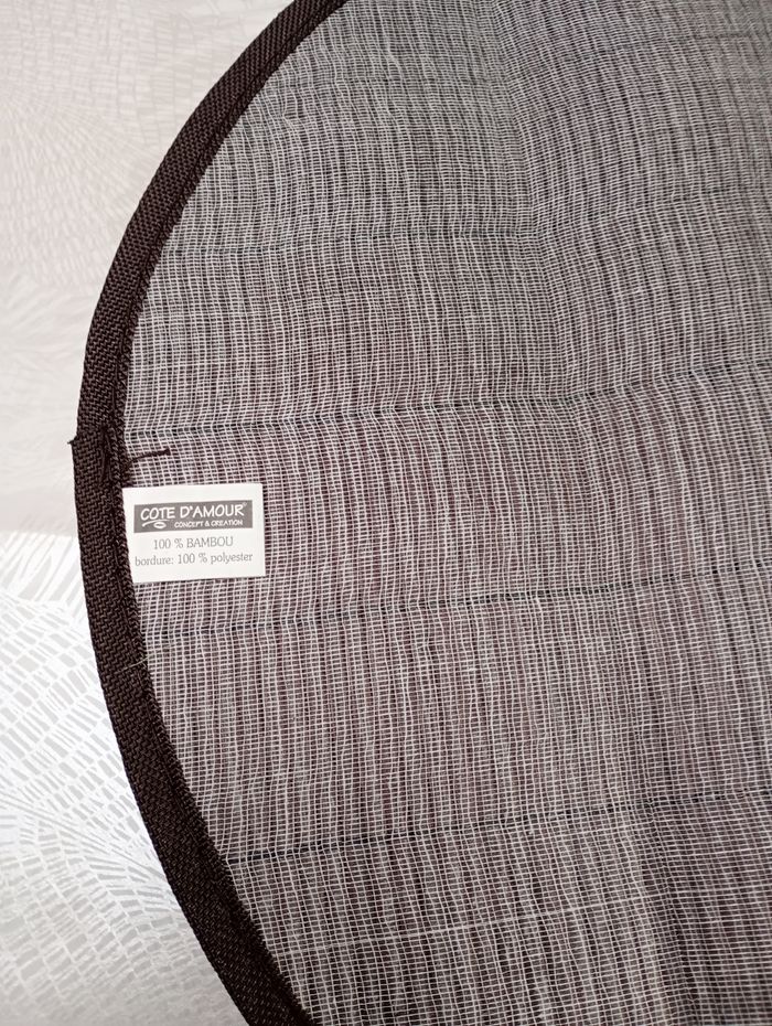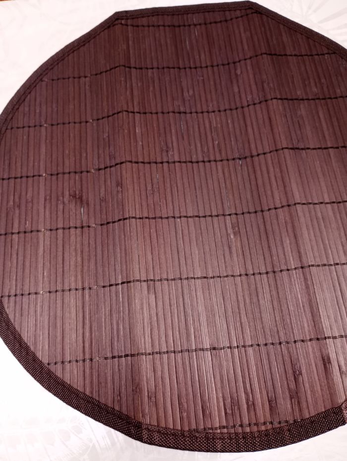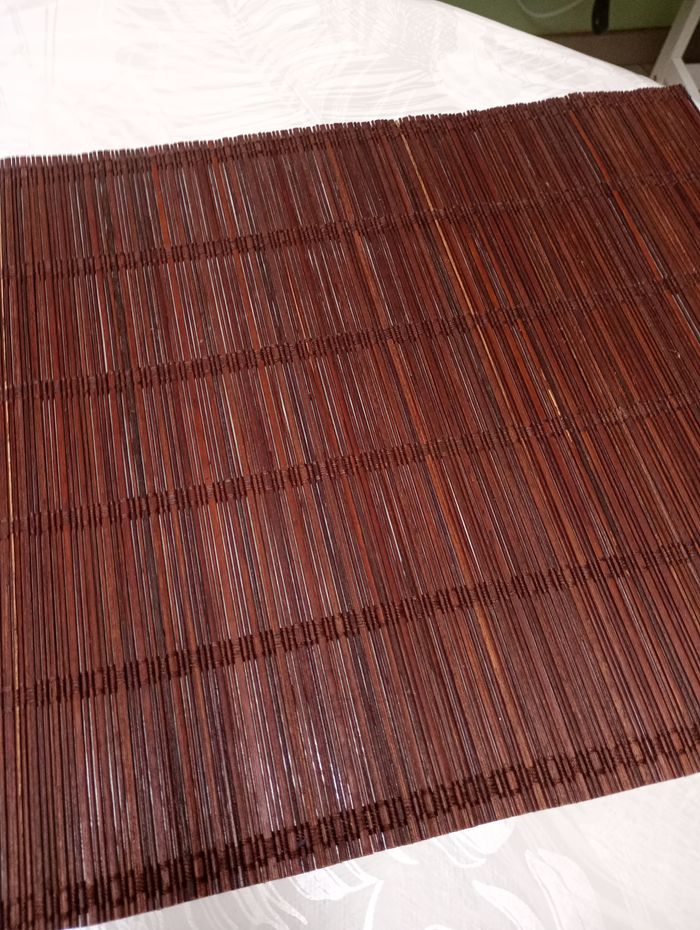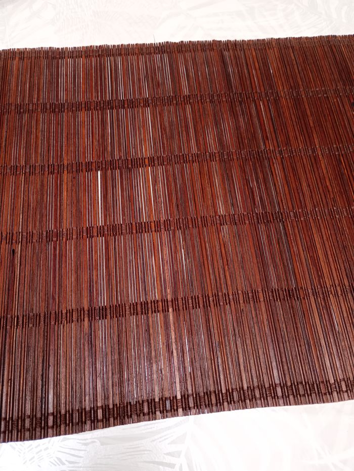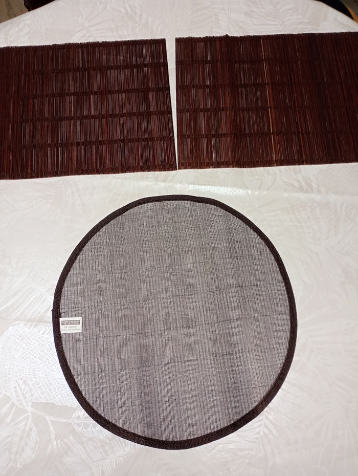 Lot de 3 sets de table en bambou. 2 Rectangulaires et 1 rond. Dimensions : 42 x 30 cm et 39 cm de diamètre. Très bon état.