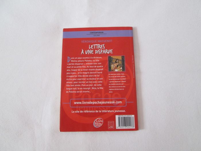 Vends livre Lettres à une disparue de Véronique Massenot. "Dans un pays soumis à la dictature, Melina pleure Paloma, sa fille "portée disparue", enlevée avec son mari et sa petite fille. Au bout de quatre ans, l'espoir de la revoir vivante disparaît peu à peu ... et le chagrin devient lourd à supporter. Elle décide alors de lui écrire pour exprimer sa douleur et son amour, pour recréer un lien avec cette fille tant aimée. Puis un jour, de cette longue nuit, la vie resurgit : Nina, la fille de Paloma serait vivante ...". N'hésitez pas à consulter mes autres annonces.