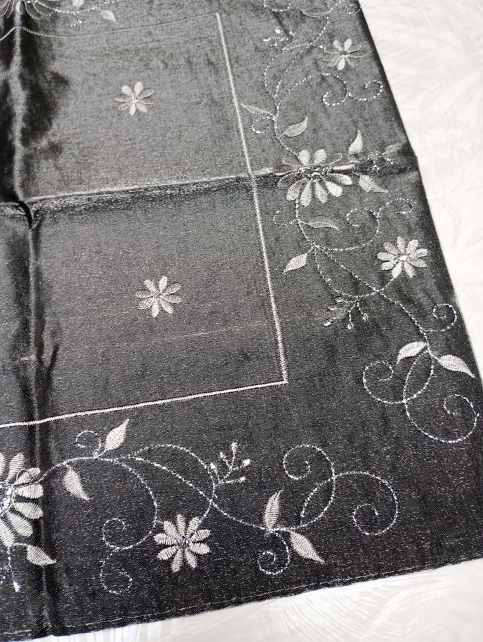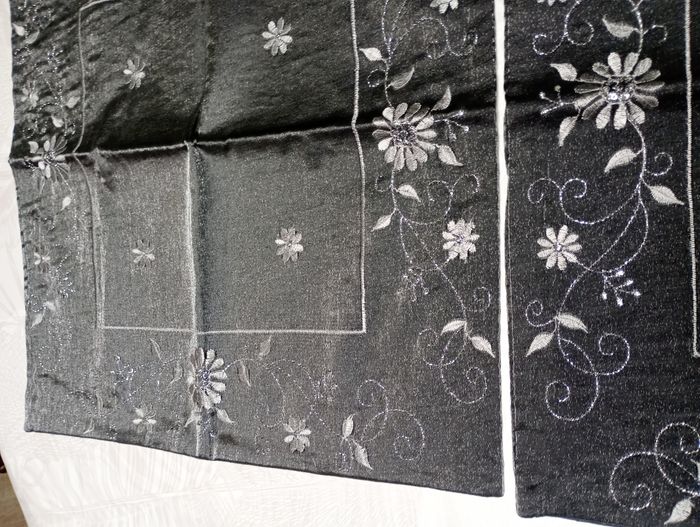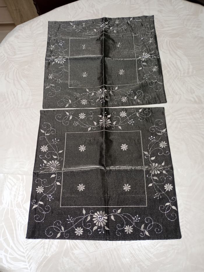 Lot de 2 housses de coussin gris foncé, matière satinée et brillante. Broderie avec fils argentés. Dimensions : 40 x 40 cm. Neuves