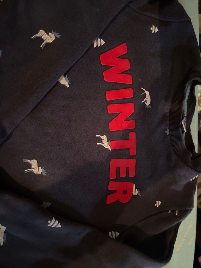 Vends sweat de marque okaid gail’e 8 ans très bon état Il est bleu marine avec winter en rouge et motifs