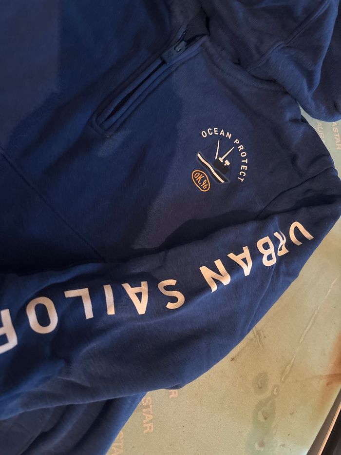 Vends sweat à capuche de marque okaidi taille 8 ans très bon état Il est bleu avec inscription sur le devant et le bras