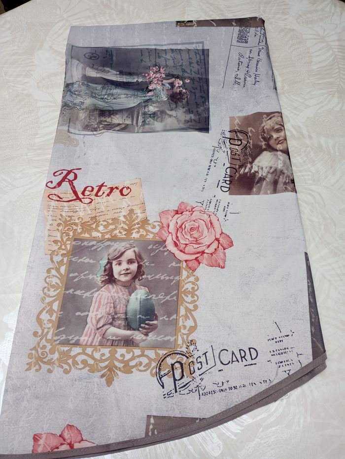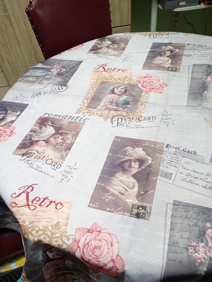 Nappe ronde de 160 cm de diamètre. Motif rétro, romantique. 100% polyester. Anti-taches et sans repassage. Neuve.