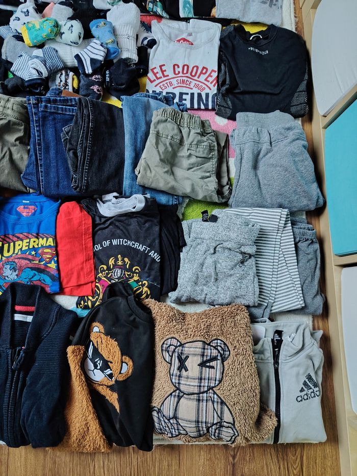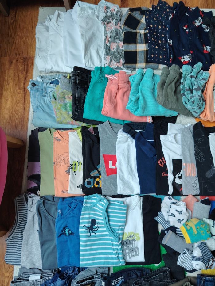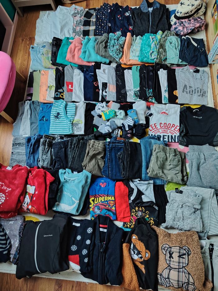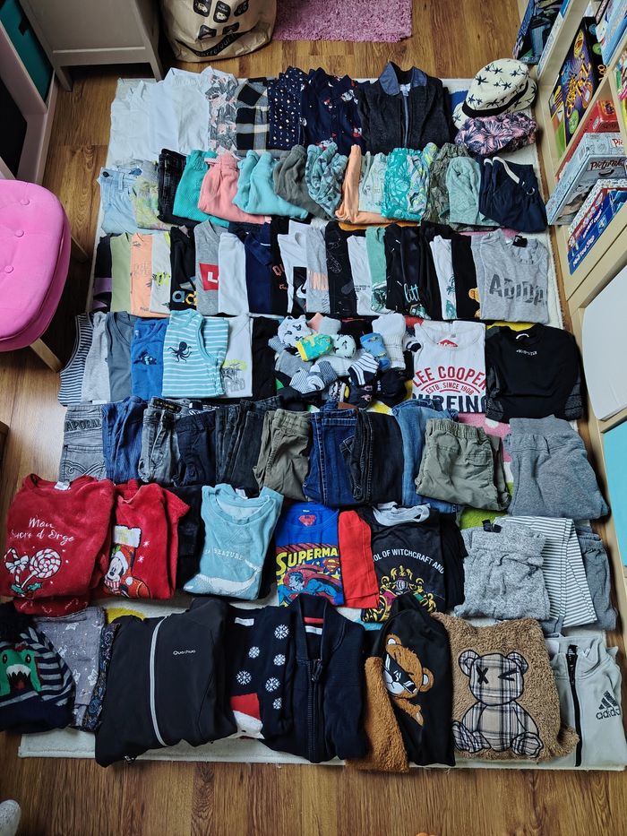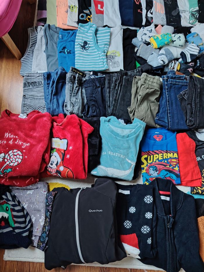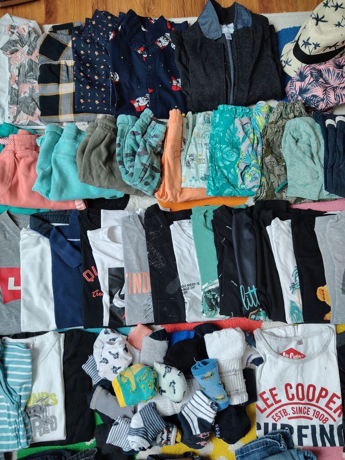 Comprends Pull gilet veste manteau bonnet foulard pyjama été et hiver , jogging pantalon jean tee shirt débardeur maillot de corps chaussettes socquettes short chemise été et hiver short de bain chapeau Tout est en parfait état Quelques traces sous le dessous de chaussettes Marques : adidas orchestra kaporal quechua Okaïdi zara h&M la redoute primark ...