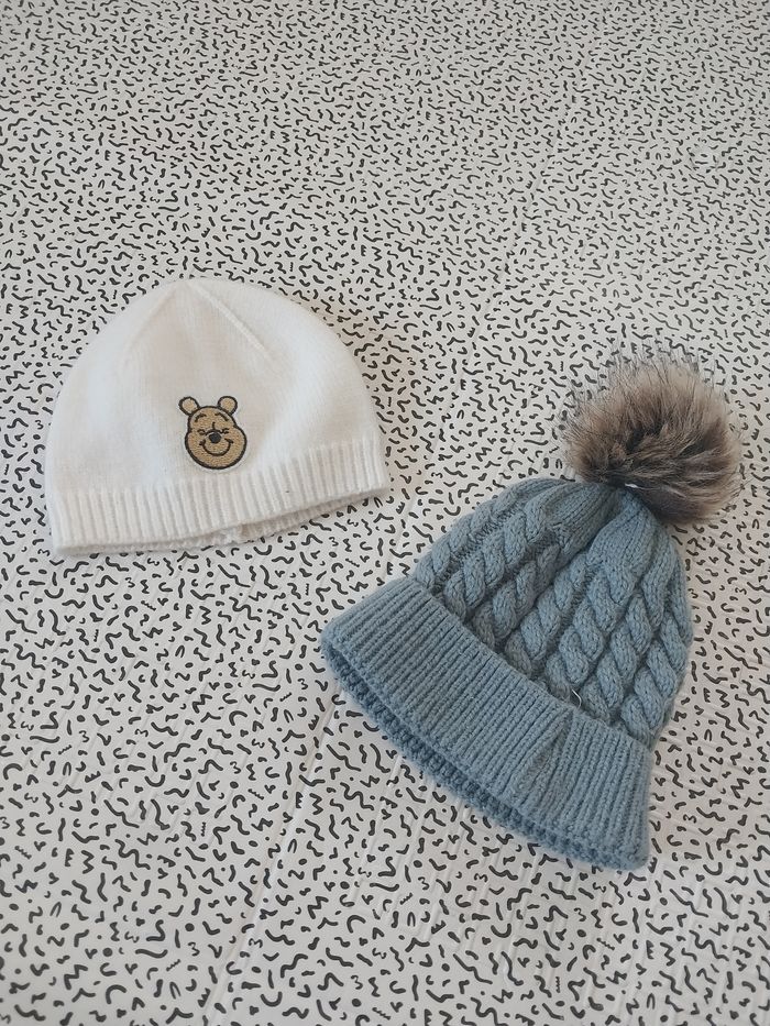 Lot 2 bonnets bébé 3/6 mois – Disney Baby Winnie + bonnet gris pompon - photo numéro 1