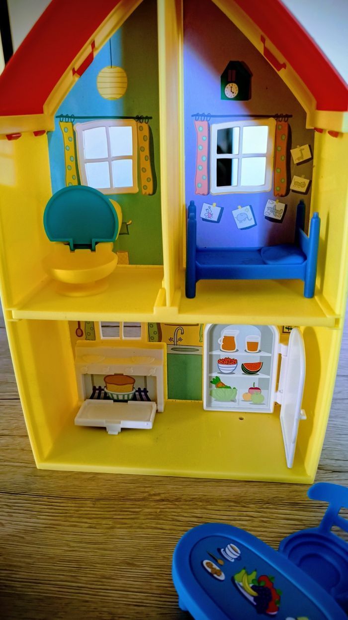 Maison Peppa pig + figurines Georges et Peppa Le frigo et le four s'ouvrent, ainsi que les WC. Comprend le lit, les toilettes, une table avec deux chaises.