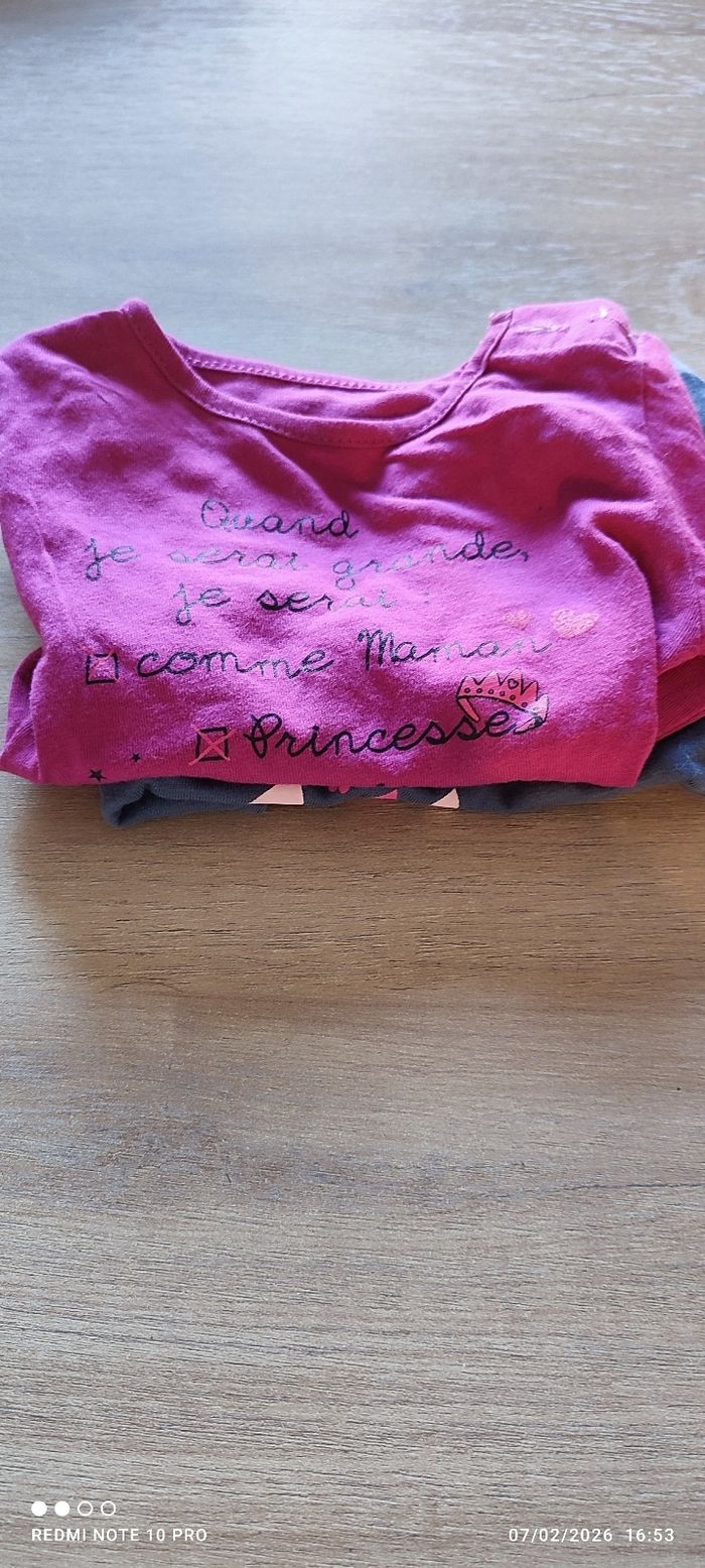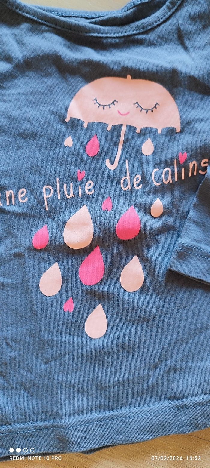 Deux hauts manches longues en très bon état. Un modèle rose avec inscription fantaisie « Quand je serai grande… » et petits dessins (princesse, fée…). Un modèle bleu avec un joli parapluie et le message « une pluie de câlins ». Couleurs vives, motifs adorables, parfaits pour le quotidien. Pressions à l’épaule pour faciliter l’habillage.