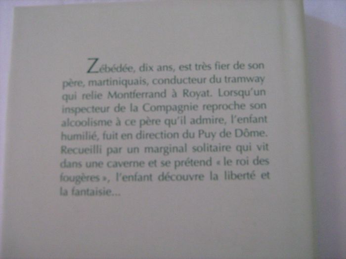 Vends livre Le roi des fougères de Jean Anglade. Comme neuf. "Zébédée, dix ans, est très fier de son père, martiniquais, conducteur du tramway qui relie Montferrand à Royat. Lorsqu'un inspecteur de la Compagnie reproche son alcoolisme à ce père qu'il admire, l'enfant humilié fuit en direction du Puy de Dôme. Recueilli par un marginal solitaire qui vit dans une caverne et se prétend "le roi des fougères", l'enfant découvre la liberté et la fantaisie..." . N'hésitez pas à consulter mes autres annonces.