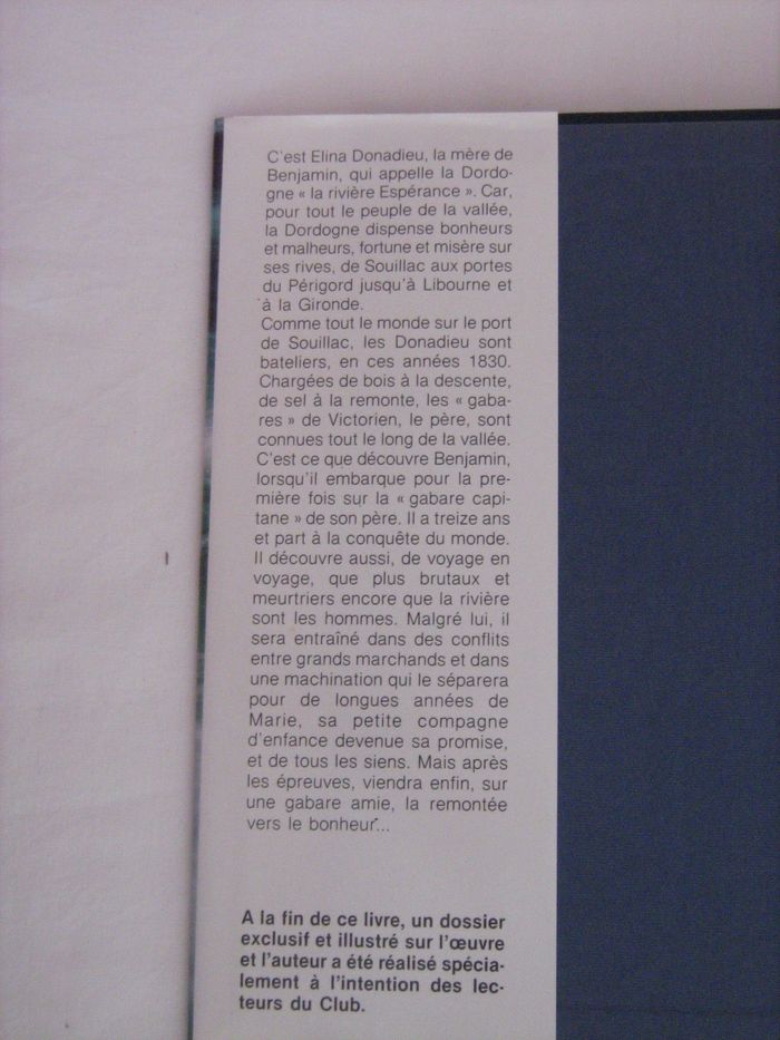 Vends livre La Rivière Espérance de Christian Signol. Comme neuf. "C'est Elina Donadieu, la mère de Benjamin, qui appelle la Dordogne "la rivière Espérance". Car, pour tout le peuple de la vallée, la Dordogne dispense bonheurs et malheurs, fortune et misère sur ses rives, de Souillac aux portes du Périgord jusqu'à Libourne et à la Gironde. Comme tout le monde sur le port de Souillac, les Donadieu sont bateliers, en ces années 1830. Chargées de bois à la descente, de sel à la remonte, les"gabares" de Victorien, le père, sont connues tout le long de la vallée. C'est ce que découvre Benjamin, lorsqu'il embarque pour la première fois sur la "gabare capitane" de son père. Il a treize ans et part à la conquête du monde. Il découvre aussi, de voyage en voyage, que plus brutaux et meurtriers encore que la rivière sont les hommes. Malgré lui, il sera entraîné dans des conflits entre grands marchands et dans une machination qui le séparera pour de longues années de Marie, sa petite compagne d'enfance devenue sa promise, et de tous les siens. Mais après les épreuves, viendra enfin, sur une gabare amie, la remontée vers le bonheur..." N'hésitez pas à consulter mes autres annonces.