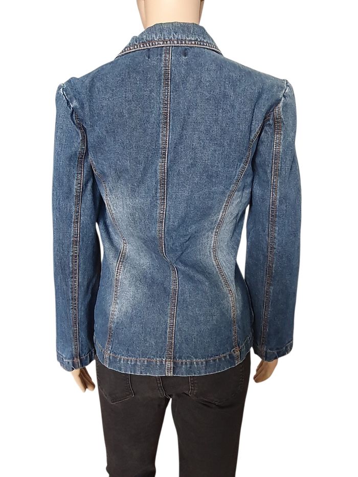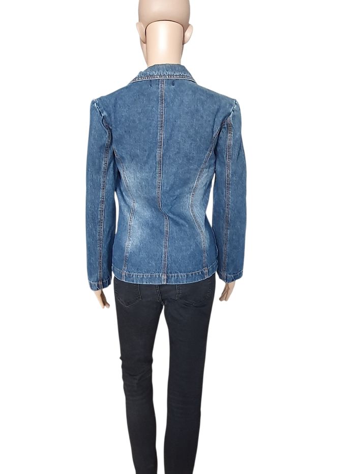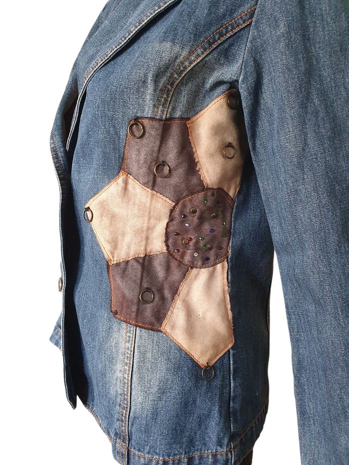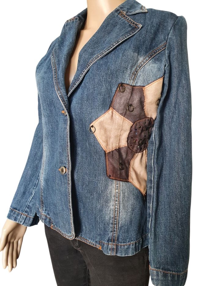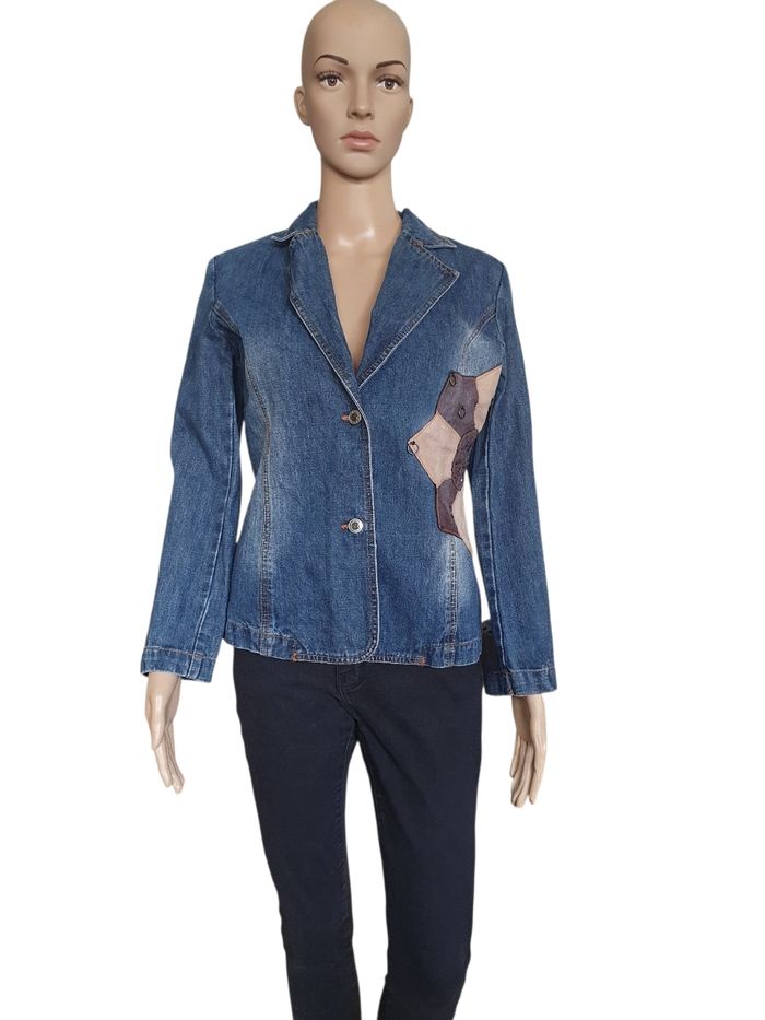 🌿 Affirmez votre style avec cette veste en jean pour femme de la marque parisienne On Parle de Vous. Bien plus qu'un simple basique, ce modèle se distingue par son design unique et ses finitions travaillées qui apportent une touche vintage et originale à toute garde-robe. 💖 Pourquoi on l'adore 💖  🤎 Design Unique : Elle arbore un superbe empiècement patchwork sur le côté gauche, mêlant des tons terreux et des textures contrastées. Le détail qui change tout ? Ses petits anneaux métalliques et ses perles colorées incrustées qui lui donnent un esprit nomade et artistique. 💚 Coupe Blazer Féminine : Sa coupe cintrée et son col à revers structurent la silhouette, offrant un compromis parfait entre la veste en denim décontractée et le chic d'un blazer. 💙 Confort & Qualité : Composée à 98% de coton, elle assure une respirabilité optimale. Les 2% de polyuréthane apportent la juste dose de souplesse pour accompagner vos mouvements sans se déformer. 🏷 Marque : On parle de vous (Paris) 🌈 Couleur : Bleu moyen avec délavage naturel 🧶Composition : 98% Coton, 2% Polyuréthane 🔸️Fermeture : Deux boutons gravés sur le devant 🏠 Prix boutique : 140€ 📐 Taille indiquée 1, correspond à un 36 📏 Pour vous assurez qu'elle vous ira parfaitement fiez-vous à la grande sagesse de Maître Ruban ⤵️  Épaule à épaule : 38 cm Aisselle à aisselle (poitrine) : 48 cm Longueur totale : 58 cm 💡 Suggestion Style : Portez-la sur une robe longue fleurie pour un look bohème chic ou avec un pantalon noir ajusté pour casser le côté classique du bureau. 🌟 Très bon état 🌟  📦 Envoi rapide et soigné