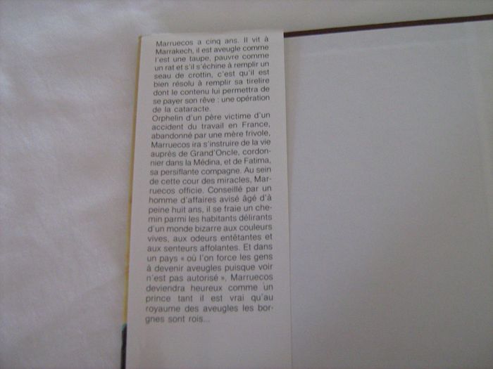 Vends livre l'Aveuglon de Agustin Gomez-Arcos. Très bon état. "Marruecos a cinq ans. Il vit à Marrakech, il est aveugle comme l'est une taupe, pauvre comme un rat et s'il échine à remplir un seau de crottin, c'est qu'il est bien résolu à remplir sa tirelire dont le contenu lui permettre de payer son rêve : une opération de la cataracte. Orphelin d'un père victime d'un accident du travail en France, abandonné par une mère frivole, Marruecos ira s'instruire de la vie auprès de Grand'Oncle, cordonnier dans la Médina, et de Fatima, sa persiflante compagne. Au sein de cette cour des miracles, Marruecos officie. Conseillé par un homme d'affaires avisé âgé d'à peine huit ans, il se fraie un chemin parmi les habitants délirants d'un monde bizarre aux couleurs vives, aux odeurs entêtantes et aux senteurs affolantes. Et dans un pays "où l'on force les gens à devenir aveugles puisque voir n'est pas autorisé", Marruecos deviendra heureux comme un prince tant il est vrai qu'au royaume des aveugles les borgnes sont rois ...". N'hésitez pas à consulter mes autres annonces.