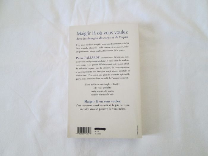 Vends livre Maigrir là où vous voulez de Pierre Pallardy. Comme neuf. "Il est assez facile de maigrir, mais on est rarement satisfait de sa nouvelle silhouette : taille toujours trop épaisse, cellulite persistante, visage gonflé, affaissement de la peau ... Pierre Pallardy, ostéopathe et diététicien, vous assure un amaigrissement dirigé et ciblé afin de remodeler votre corps et de garder définitivement votre poids idéal. Sa méthode repose sur la détente, la concentration, le rassemblement des énergies respiratoire, mentale et alimentaire. C'est aussi une grande aventure spirituelle qui va vous entraîner bien au-delà de l'amaigrissement. Cette méthode est simple et facile : elle vous prendra trois minutes le matin et trois minutes le soir. Maigrir là où vous voulez, c'est retrouver aussi la santé et la joie de vivre, une idée vraie et positive de vous-même". N'hésitez pas à consulter mes autres annonces.
