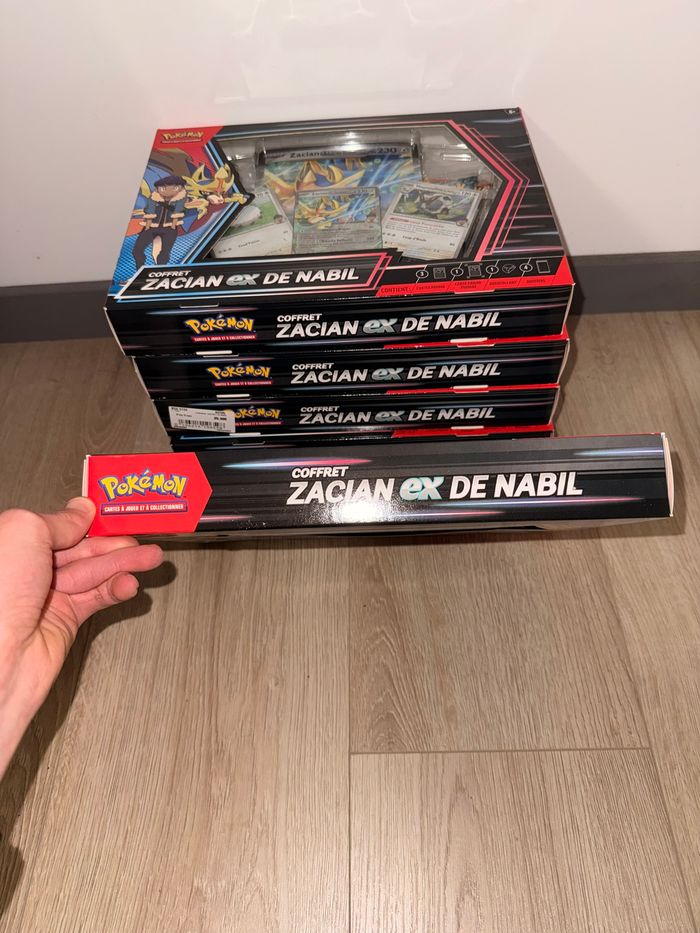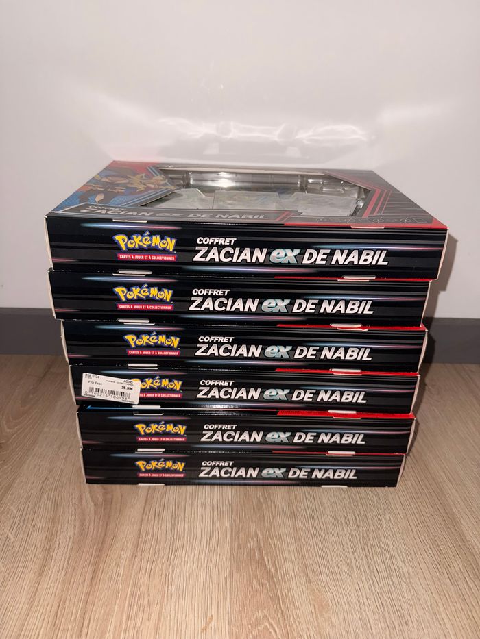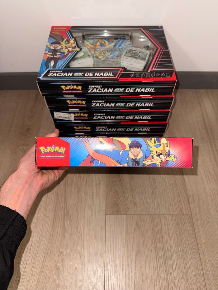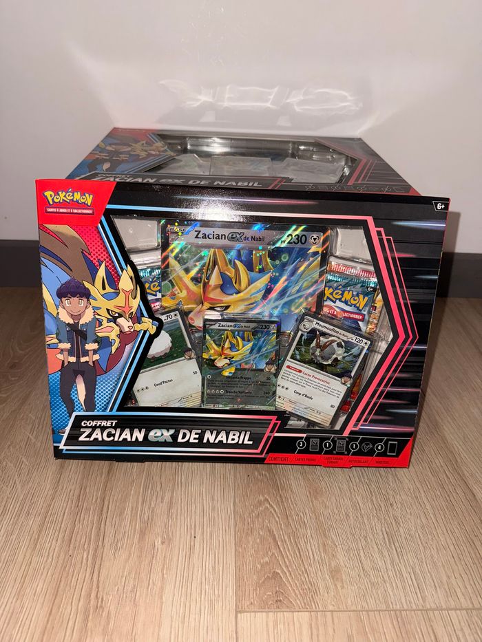 🔥 Coffret Pokémon Collection "Zacian ex". Extension : Écarlate et Violet – Aventures Ensemble (Série EV09). État : 100% NEUF et SCELLÉ (Version Française FR). Jamais ouvert, scellage d'origine intact. Contenu du coffret : ✨ 1 carte promo brillante de Zacian ex. ✨ 4 Boosters : X2 EV09, X1 EV08, X1 EV02. 📦 STOCK DISPO : J'en ai 6 en tout. 💡 VENTE EN LOT : Possibilité d'acheter par 2, 3 ou plus pour économiser sur les frais de port ! Envoyez-moi un message pour faire un lot. Idéal pour compléter la série EV09 ou pour garder scellé (Display). Envoi rapide et très bien protégé dans un carton solide 📦