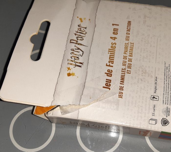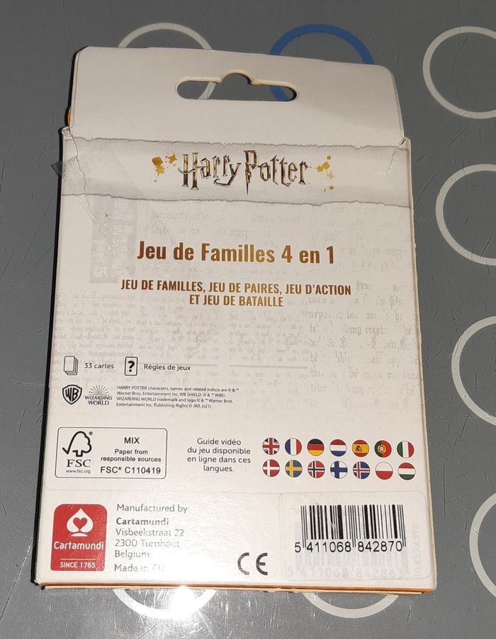 Jeu de famille 4 en 1 Harry Potter Suffle Des 4 ans Cartes complètes Réglé du jeu Manque un jeton Boite abîmée Très bon état Description Vous trouverez dans cette boîte un jeu de cartes permettant de jouer à 4 jeux, inspirés des célèbres Uno, 7 familles, Bataille et Memory. Chacune des cartes est joliment illustrée avec un personnage d’Harry Potter. Une belle idée de cadeau pour les jeunes fans de la saga ou un bon moyen d’avoir 4 jeux de société en 1 !
