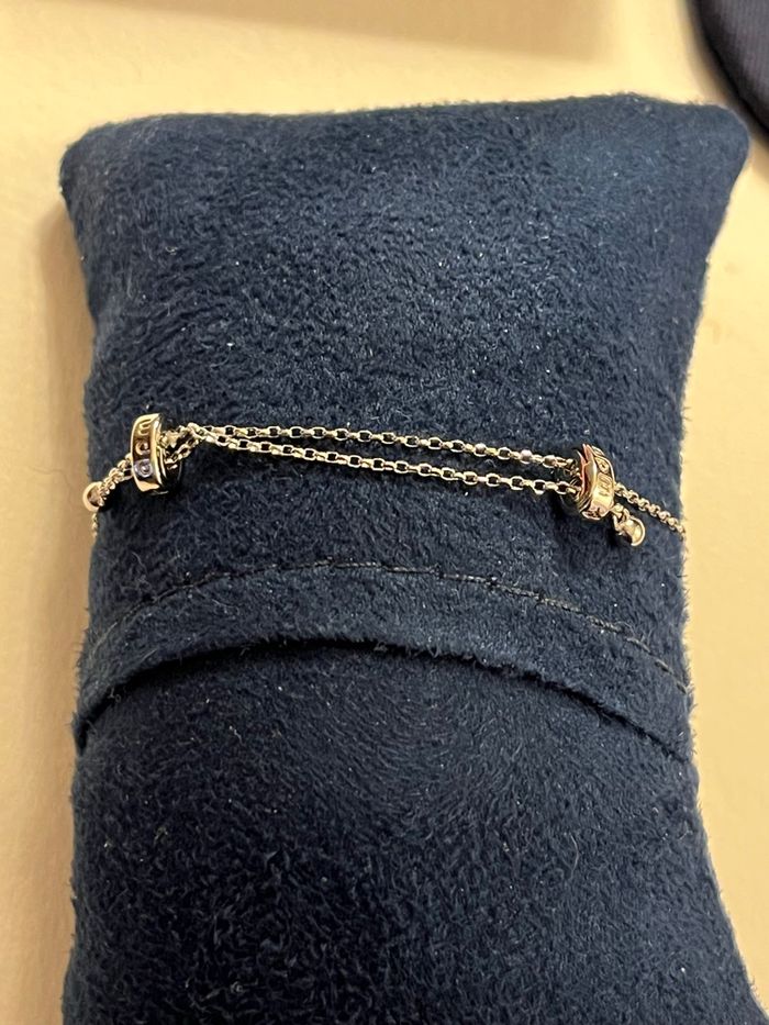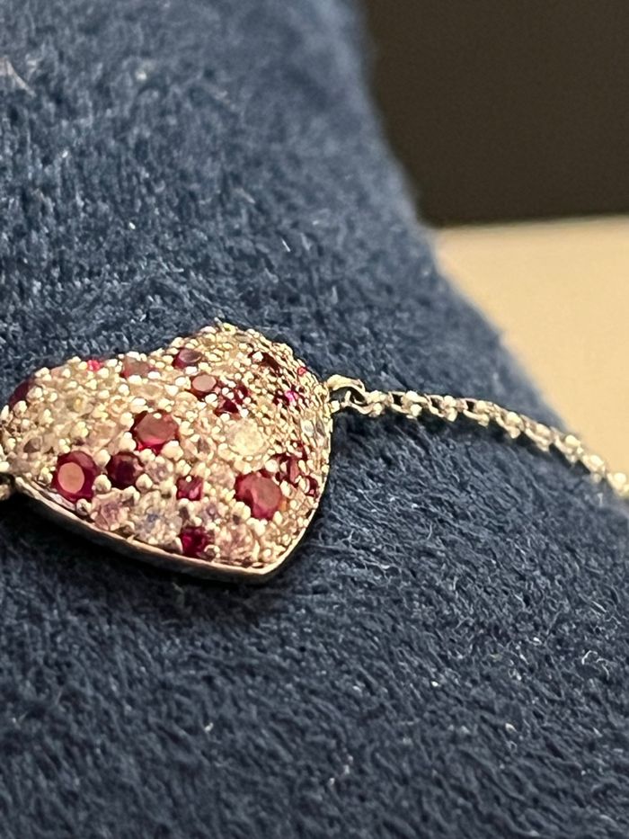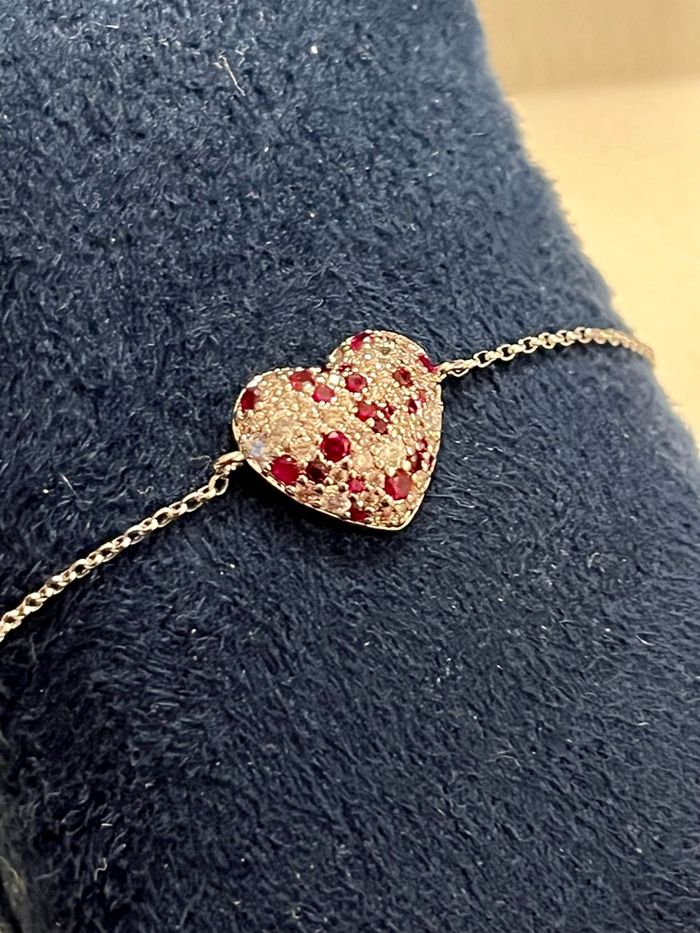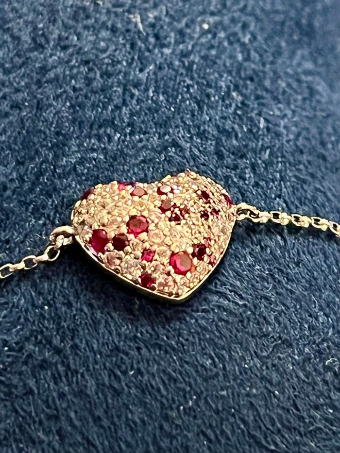 Bracelet APM Monaco original, modèle élégant et raffiné avec motif pavé de pierres scintillantes et **pierres roses • Marque : APM Monaco • Matière : argent • Couleur : argenté • Pierres : zirconiums blancs + pierres rouges • Fermeture : **chaîne ajustable** (convient à plusieurs tailles de poignet) • Style : chic, lumineux, parfait en accumulation ou seul Très joli rendu au poignet, capte magnifiquement la lumière. Idéal pour une tenue habillée ou pour apporter une touche romantique Aucune pierre manquante, brillance intacte (voir photos). Vendu avec boîte cadeau Apm Monaco 📬 Envoi rapide et soigné 📩 Disponible pour toute question