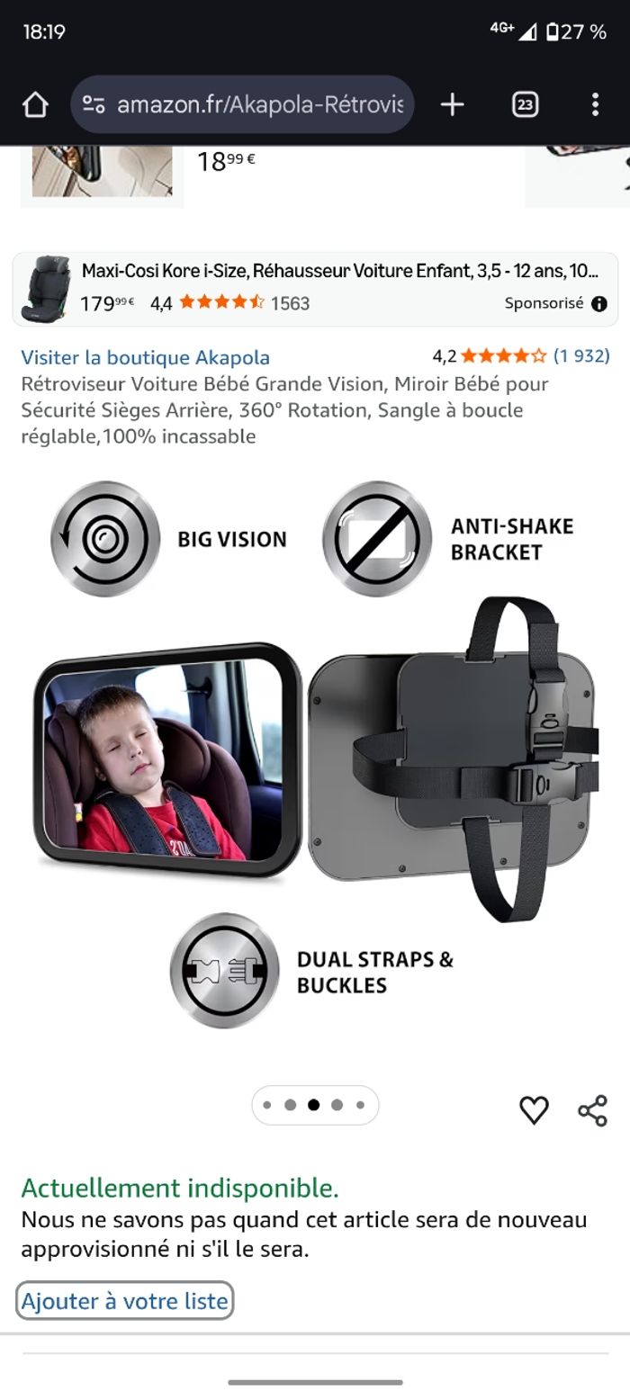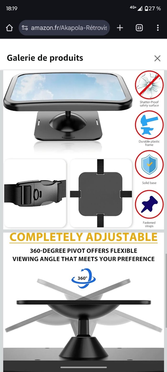 Rétroviseur Voiture Bébé Grande Vision ( Miroir Bébé pour Sécurité Sièges Arrière) 360° Rotation, Sangle à boucle réglable, 100% incassable Position de la pièce automobile : Arrière Dimensions de l'article : 30 x 20 x 7 centimètres Matériau : Acrylique, Plastique Marque : Akapola ❤ 【Grand angle et réflexion claire】Retroviseur voiture bebe taille : 29 cm x 19 cm. Nos rétroviseurs pour bébé sont plus grands que les rétroviseurs pour bébé sur le marché pour un champ de vision plus large. Ce qui vous permet d'avoir une vue dégagée et de surveiller la sécurité de votre bébé à chaque fois que vous conduisez. ❤ 【Absolument sûr】Le rétroviseur bébé voiture fabriqué en verre de sécurité acrylique incassable et entouré d'un cadre en plastique noir. La connexion de ceinture robuste et la conception de la boucle de ceinture de sécurité arrière garantissent que nos bébés sont en sécurité à 100%. ❤ 【Réglage à 360 degrés】 Le retroviseur voiture bébé est connectée à la fixation du dossier rotatif et peut atteindre une mobilité totale à tous les angles du véhicule, de sorte que vous pouvez voir confortablement le siège bébé monté à l'arrière. ❤ 【Installation et démontage simples】 2 x sangles de fixation avec boucles, vous pouvez fixer le miroir sur des appuie-tête de différentes tailles et formes, facile à assembler et à installer, adapté à tous les véhicules avec appuie-tête réglables. Bon état, quelques rayures mais ne gêne pas du tout lors de l'utilisation (voir photo)