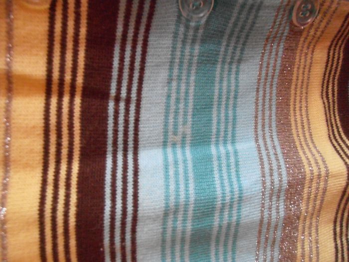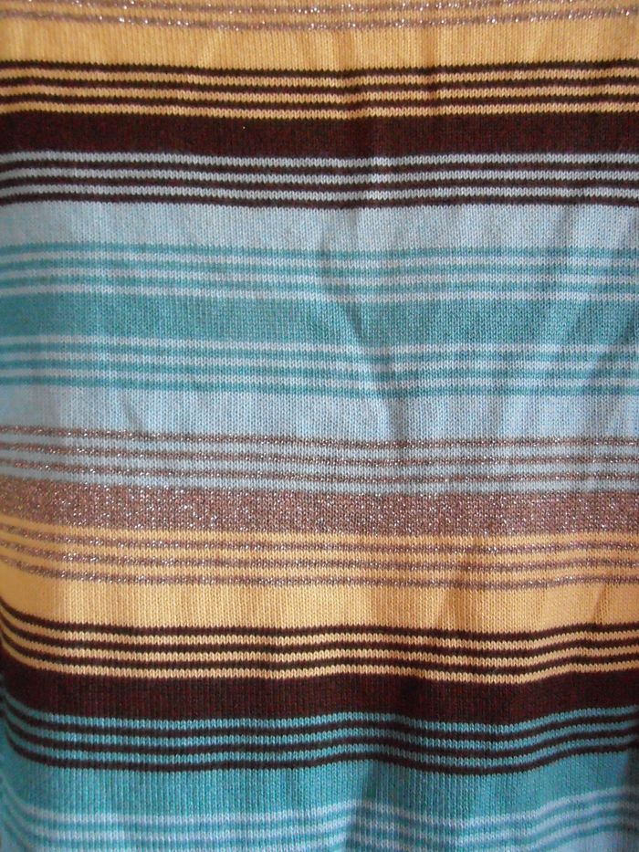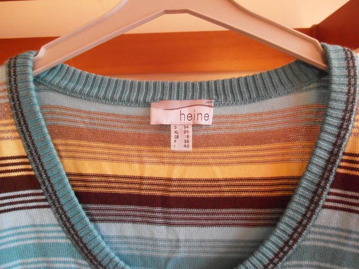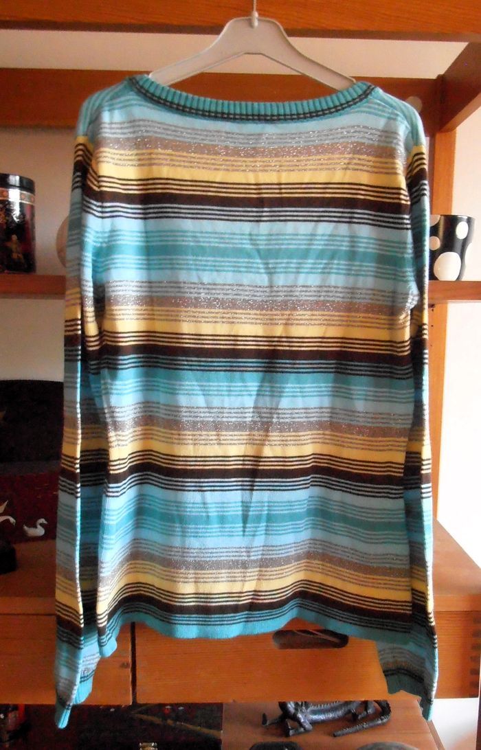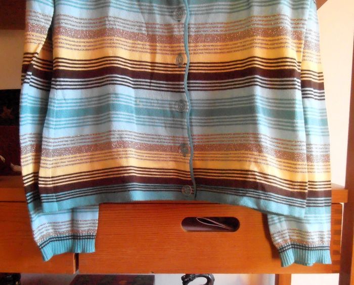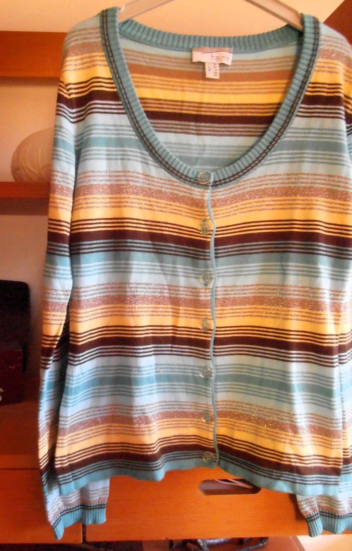 Cardigan, gilet femme, marque Heine , taille S 36, couleurs bleu, marron, jaune, et argenté, motif à bandes horizontales. Mailles fines, Col rond, manches longues, rangé de boutons transparents. En bon état (juste deux petites marques de décoloration : voir photo). Bien pour toutes saisons !