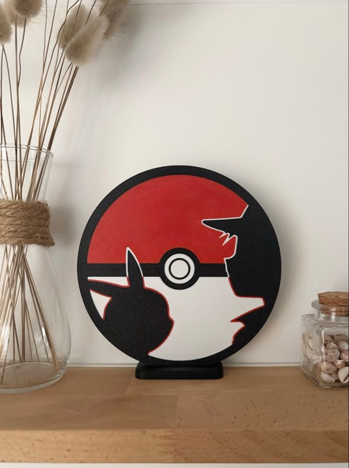 Modélisé et imprimé par mes soins Fabriqué en France • Diamètre : 150 mm • Épaisseur : 3 mm • Support fourni pour une pose stable sur étagère, bureau ou table • Design moderne en silhouettes contrastées • Parfait pour chambre, bureau, gaming room ou déco geek minimaliste • Objet léger et facile à déplacer • Idée cadeau idéale pour les fans de Pokémon, collectionneurs et gamers