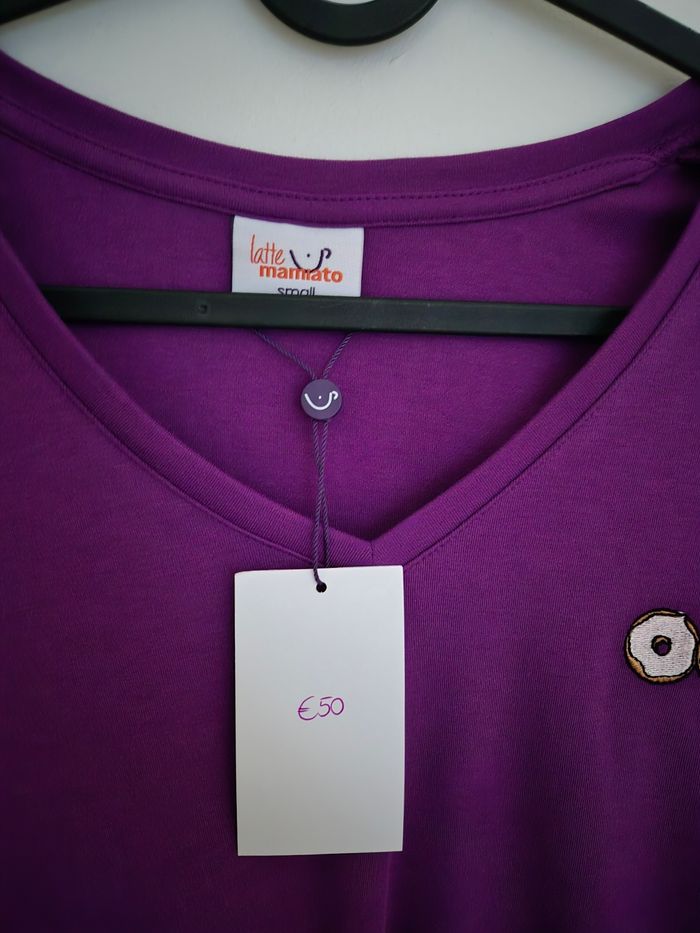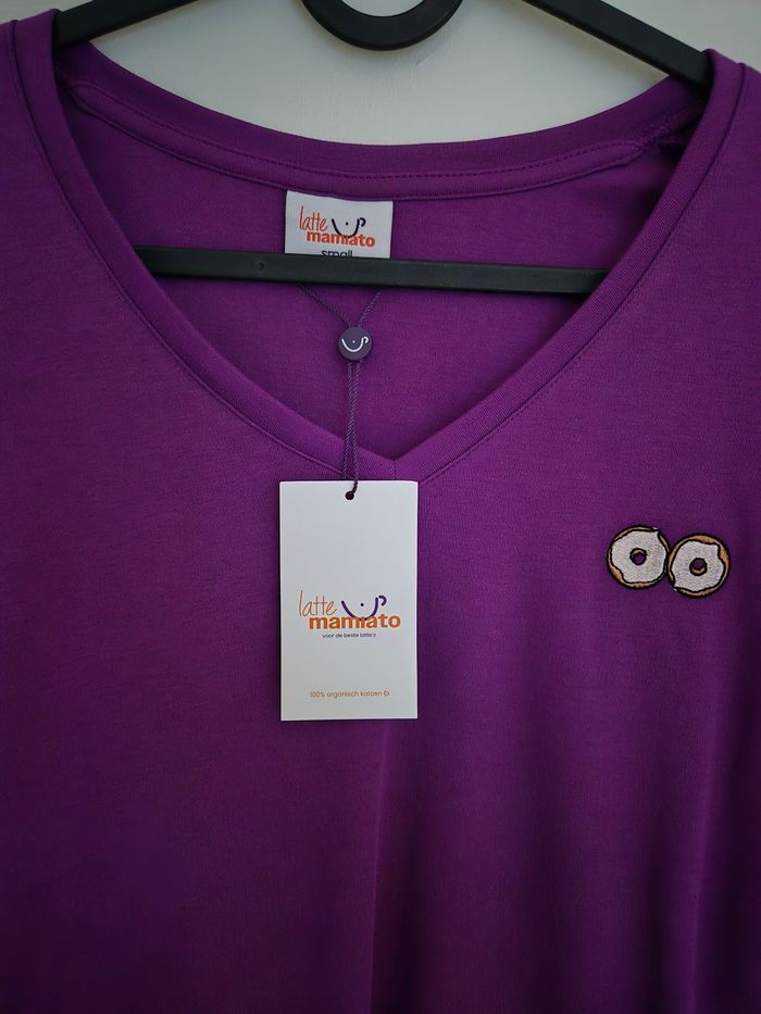 Top pour allaiter violet. Taille S ample. Broderie donuts 😊 Coton épais hyper qualitatif. Marque Latte mamiato. J'ai d'autres vetements pour allaiter de marque kiabi, you&milk, brave margot, tajine banane. N'hésitez pas a regarder.