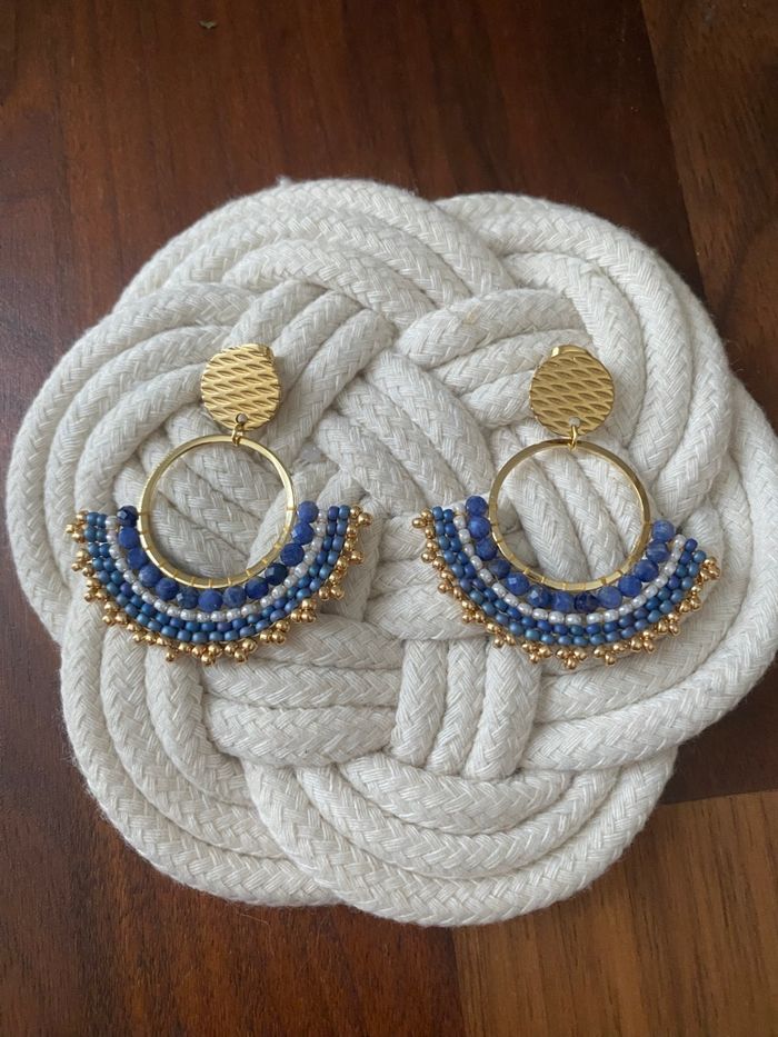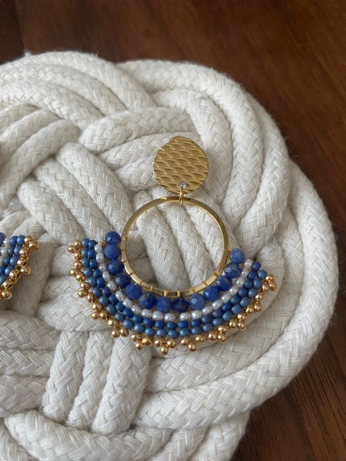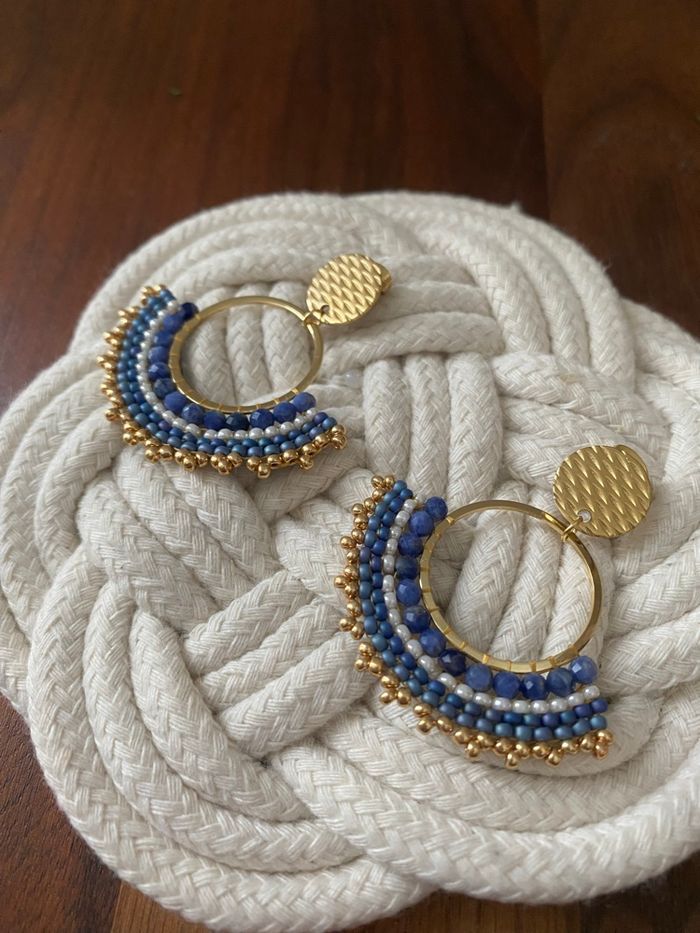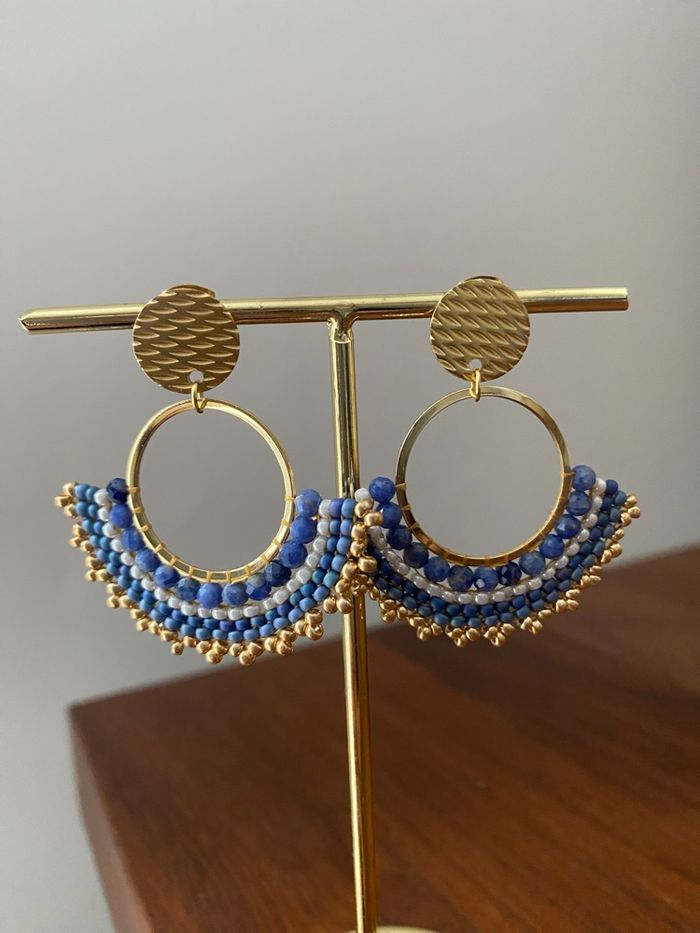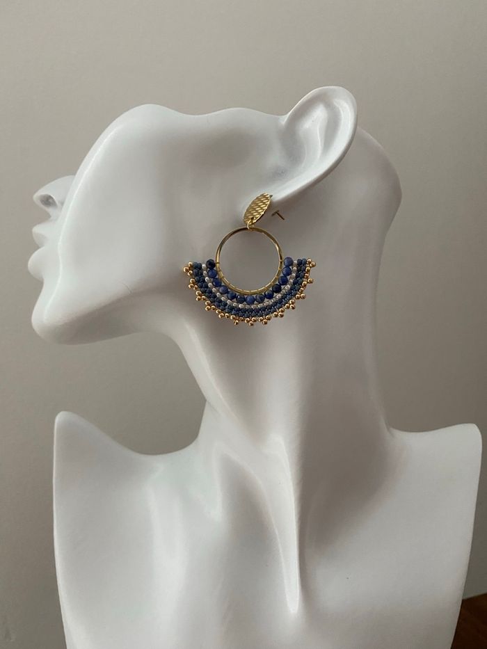 Boucles d’oreilles Miyuki réalisées avec une première rangée de pierres naturelles de Sodalite facettées puis des rocailles Miyuki. Clous d’oreilles et anneaux en acier inoxydable dorés à l’or fin. Longueur totale des boucles d’oreilles 4,5 cm. Article neuf.