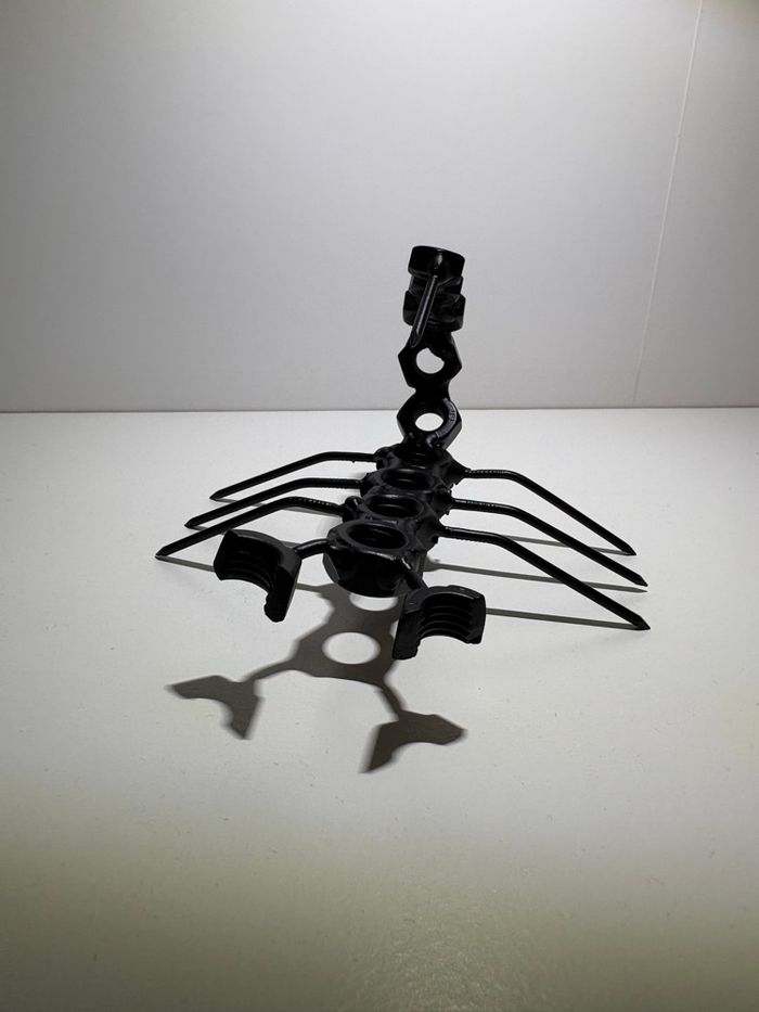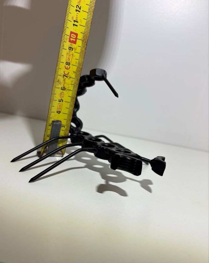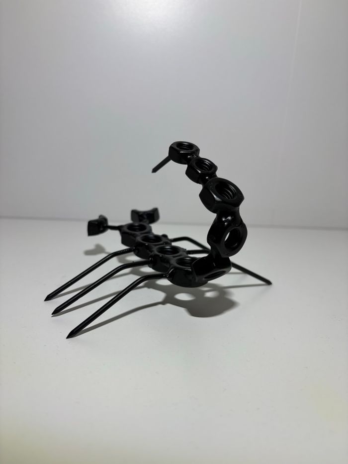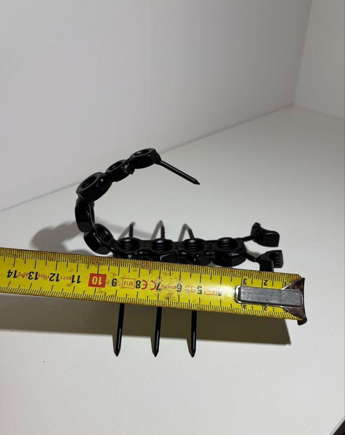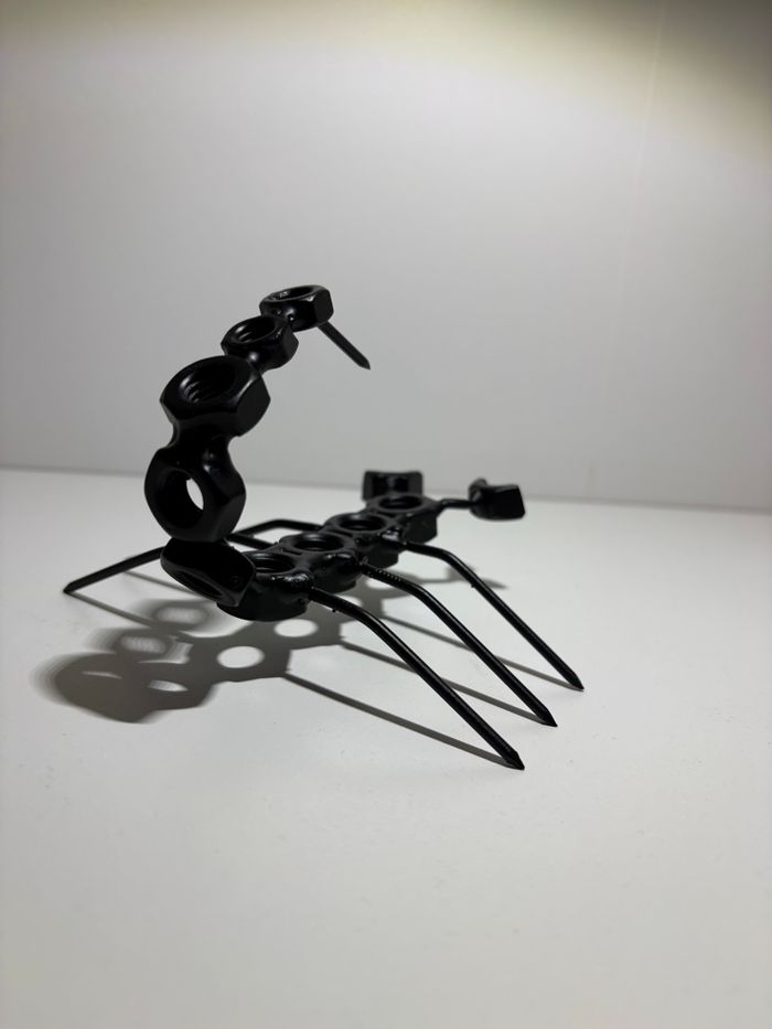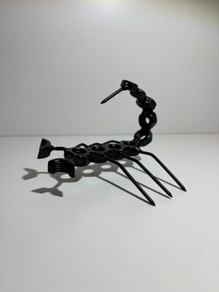 Sculpture originale en métal représentant un scorpion, fabriqué à partir d’écrous soudés et de pointes, entièrement peinte en noir mat. Cette œuvre artistique allie créativité et recyclage, apportant une touche moderne et audacieuse à votre décoration intérieure. Idéal pour les amateurs d’art unique ou pour une décoration originale dans un espace contemporain. Dimensions compactes, parfaite à exhiber sur une étagère ou un bureau. Ajoutez une pièce intrigante et artistique à votre intérieur avec cette sculpture en métal recyclé. #Artisanat #DécorationMurale #SculptureUnique #Recyclage #ArtModerne