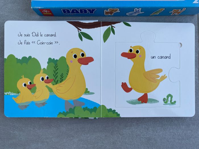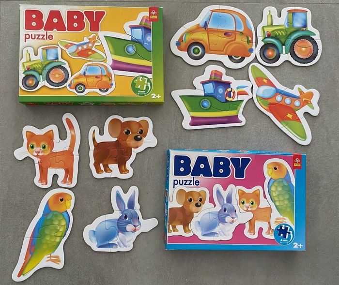 Lot de puzzles faciles pour bébé / jeunes enfants crèche , maternelle 2 boites de 4 puzzles Baby puzzle Trefl grosses pièces facile pour bébé / enfant à partir de 2 ans Les transports : voiture , tracteur, bateau, avion Les animaux : chat, chien, perroquet, lapin Très bon état - Complet dans leur boite Mon livre puzzle pour les petites mains A la ferme Avec 6 grandes pièces Neuf