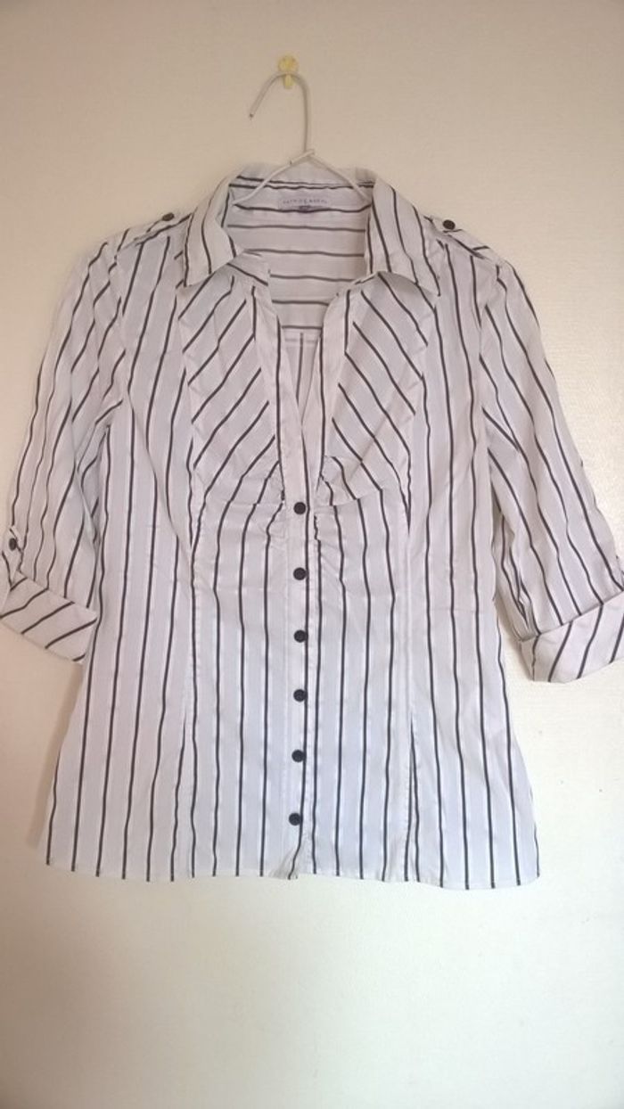 Chemise habillée, taille M 38, marque Patrice Bréal, bonne qualité, couleur blanche rayée noire, coupe cintrée, col en V, manches courtes, boutons noirs. Jolie portée avec un tailleur par exemple, élégante et professionnelle. Prix d'origine en magasin 40 euros, je la revends neuve sans étiquette !